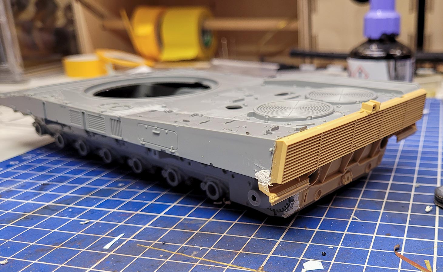 Daher habe ich meinen Bausatz des Ryefield Leopard 2 A7 dahingehend geplündert. Während die allgemeine Breite ganz gut passt, wird es schwierig da die Winkelung und Länge der unteren und oberen Heckwand doch etwas unterschiedlich ist. Hier kommt man nicht um etwas Schleiferei herum plus Abtrennen von Plastikteilen und am Ende Verspachteln der seitlichen Lücken. Hier muss man etwas Zeit investieren und immer wieder anpassen und prüfen wo es noch klemmt. Das Verspachteln ist nicht so dramatisch, denn der Bereich wird später von Treibrad, Kette und Schmutzfänger großflächig verdeckt.