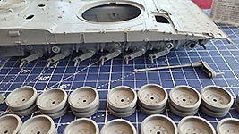 Laufrollen, Leiträder und Treibräder werden aus jeweils 2 Halbteilen zusammengebaut, was recht einfach geht und es sind pro Rad drei Angüsse zum Versäubern ... das macht etwas Arbeit, aber es hält sich im Rahmen. Nach dem Aufstecken der Laufrollen und Leiträder werden die Radnabenabdeckungen mit einem kleinen Klecks Kleber auf den Naben fixiert. Der Clou liegt hier darin, dass der Kleber keinen Kontakt zum Rad ansich erhält, sodass die Räder drehbar bleiben. Das ist zwar nicht zwingend notwendig, aber es erleichtert am Ende die Bemalung der Laufrollen.