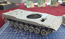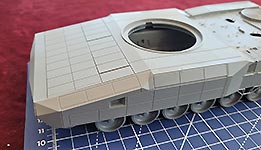 Der vordere Teil der Wanne, also vom Motordeck aus nach vorn bekommt komplette neue Überpanzerungselemente, inklusive der Aufpanzerung rund um den Turmdrechkranz. Die Zusatzpanzerelemente der Glacisplatte und Wannenseiten machen soweit einen guten Eindruck. Ganz leicht kann man in den Fugen der Zusatzpanzerelemente der Glacisplatte erkennen, dass sich dort zwei Luken befinden sollen - offen darstellen kann man diese nicht.
