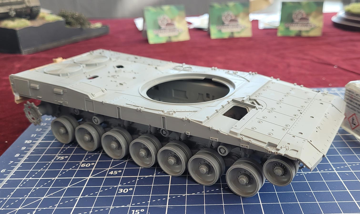 Die Unterwanne ist mehrteilig mit Bodenplatte, Seitenteilen und Heckplatte zusammenzubauen und von vorigen Leopard 2 Bausätzen bereits bekannt und bewährt.