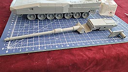 Das Ganze wird auf einen kastenförmigen Anbau (Autolader) angesetzt, der widerum doppelt beweglich gelagert wird. Dadurch wird in der Turmaussparung das Rohr auf eine besondere Art gelagert und kann so bei dem flachen Turm trotzdem das Rohr nach unten neigen.