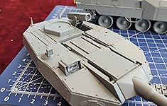 Dann kann man den Turm flugs mit den weiteren Anbauteilen versehen werden - zunächst die vorderen Trophy Radarsensoren, bei denen man nur schauen muss, dass diese sich exakt an den anderen Seiten anlegen.