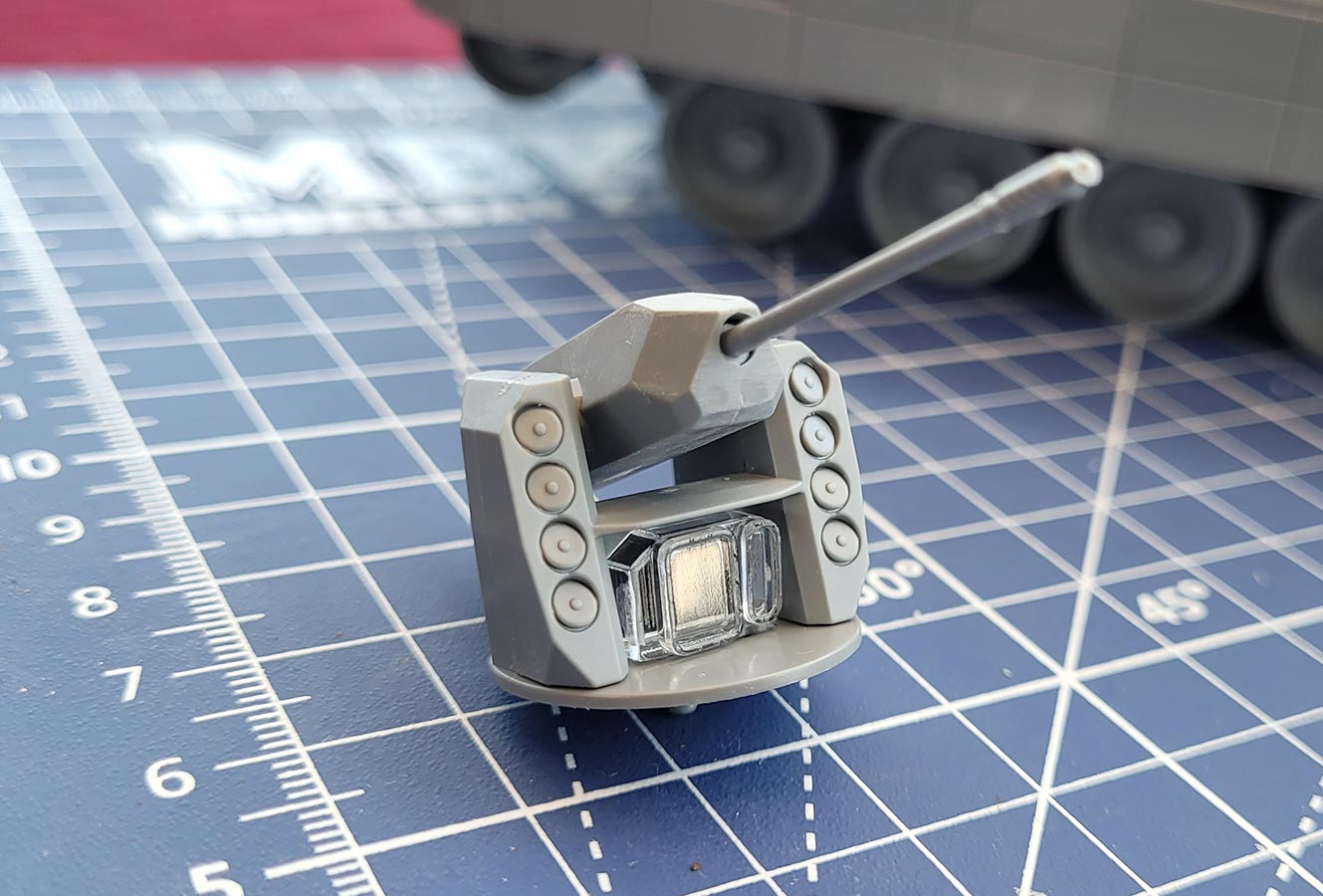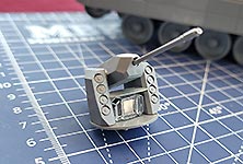 Ebenfalls ist eine sekundäre Waffenstation im Bausatz enthalten, die auf dem Turmdach im hinteren Bereich zu sitzen kommt. Diese baut sich auch nur aus wenigen Teilen zusammen. Das Rohr der 30mm Kanone ist einteilig aus Plastik mit feinen Details. Die ganze Waffe bleibt dann in der Höhe als auch in der Seite beweglich.