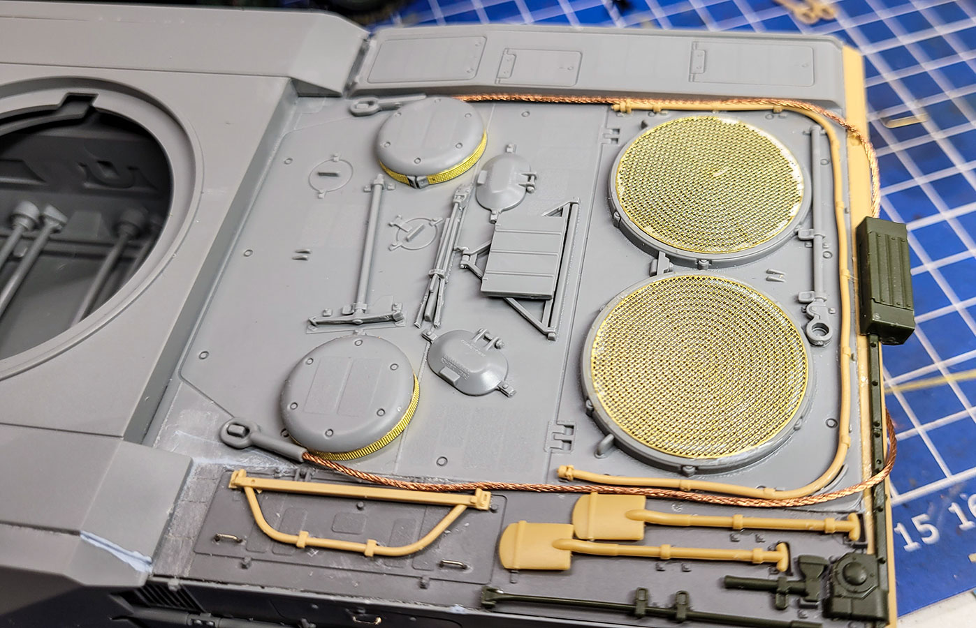 An der Heckwand wird das Tarnleitkreuz angebracht und die Standard Bauteile wie Ringlüfter, Lauftansaughutzen und Betriebsstoffdeckel aufgeklebt. Auf den Ringlüftern werden die feinen PE Gitter mit Sekundenkleber aufgeklebt, was immer wieder eine Herausforderung ist, genau in der umlaufenden Kante schnell genug (aber auch nicht zuviel) Sekundenkleber aufzubringen und das Gitter dann schnell exakt passend aufzulegen.