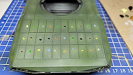 Das Rohr der Waffenstation wurde in glänzend schwarz bemalt und die einzelnen Linsen der Optiken haben unterschiedliche Transparenttöne wie transparent gelb oder transparent blau bemalt.