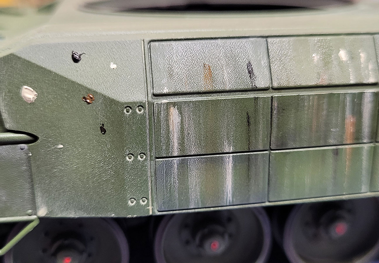 Beim Anbringen der Aufsatzpanzerung mit dem neuen Bug und den Seitenpanzerungselementen kann ich nur empfehlen diese ruhig mehrfach trocken anzupassen, bis man eventuellen Unklarheiten der Positionierung und Unsauberheiten von Kontaktstellen vollständig geklärt hat. Dann würde ich alle Bauteile direkt hintereinander weg an- und zusammenkleben und an der Wanne dann fest miteinander andrücken und laufend auf Spalten überprüfen. Und keine Sorge - Spalten zwischen den seitlichen Schürzen und der seitlichen Zusatzpanzerungen sind normal - diese sind auch am Original vorhanden.