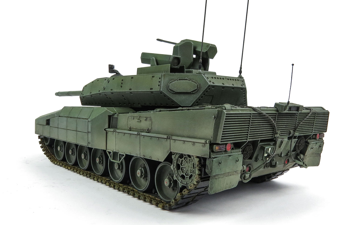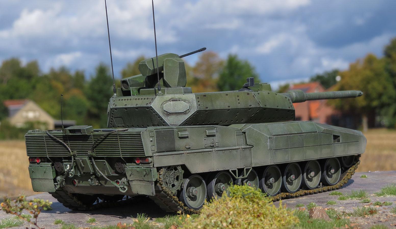 Kniffliger wurde es mit der Heckwand, denn die Fotos des Originals zeigen eine Heckwand des Leopard 2 A7 und nicht wie im Bausatz mit der neu produzierten Heckwand mit hochgezogener Beleuchtung wie bei A7V und A8.