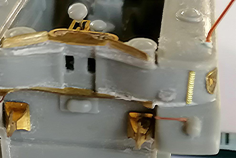 Zuerst das Bauteil A9 an dem ich einiges an Plastik wegschnitzen musste, um PE-Teile zu ergänzen. Im Bauteil sind hier die Anzeigen als flache, glatte Scheiben aufgeprägt. Wäre ja noch i. O., wenn es dafür wenigstens Nassschiebebilder geben würde, aber leider Fehlanzeige. EDUARD bietet hier einen farbigen Papierdruck an, der unter das entsprechende PE-Teil geklebt wird. Die Anzeigen habe ich in mehreren Durchgängen mit Klarlack „aufgefüllt“ bis der Eindruck einer Verglasung entstand.