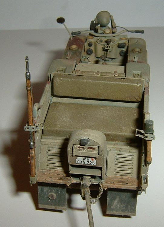 Die Ketten wurden mit Dark Tracks von AMIG gespritzt über die dann noch ein leichter Hauch von verschiedenen Rosttönen gelegt wurde. Die Kettenpolster und Gummianteile der Räder wurde mit Vallejos Tyre Black bemalt.
