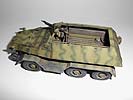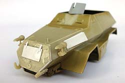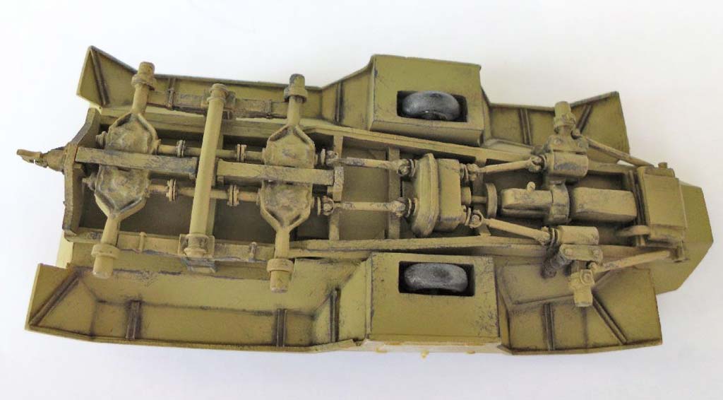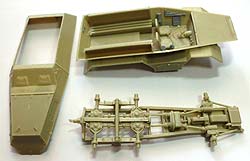 Fahrgestell und Unterwanne lassen sich ohne Probleme einfach der Bauanleitung folgend, zusammensetzen, wobei ich beide bereits vor dem Lackieren miteinander verklebte. Das Versäubern der einzelnen Komponenten entsprach dem Werkstoff bedingten, üblichen Rahmen und war für fast alle Teile in kürzester Zeit erledigt. Das Modell verfügt über eine einfach gestaltete, aber meiner Meinung nach ausreichende Inneneinrichtung mit Sitzbänken und Staukästen für die Mannschaft sowie entsprechend gestaltetem Fahrerplatz. Auch die in Frankreich damals übliche rechtsseitige Steuerung ist berücksichtigt. „Frei Schnauze“ ergänzt habe ich eine MP in Halterung für den Beifahrer, Feuerlöscher, Gasmaskenbehälter und Munitionssäcke für das MG sowie ein paar Kleinigkeiten mehr. Zusätzlich erhielt die Hecktür einen Verriegelungsmechanismus.