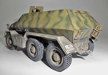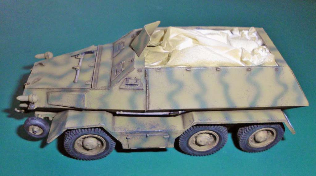 Der seitliche Panzerschutz für die Luftein- bzw. auslässe des Motorraumes nebst Klappe auf dessen Frontpanzerplatte hier waren noch ein paar Nieten zu ergänzen - entstand durch dünnes Plastikmaterial. Größe und Form leitete ich entsprechend von den Vorbildfotos ab. Tja, das war es dann auch schon. Gut, die Vorderräder montierte ich noch leicht eingeschlagen.