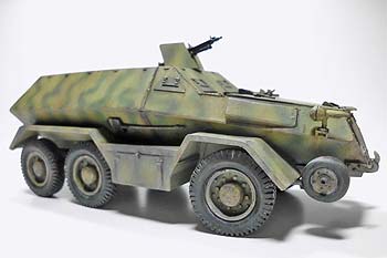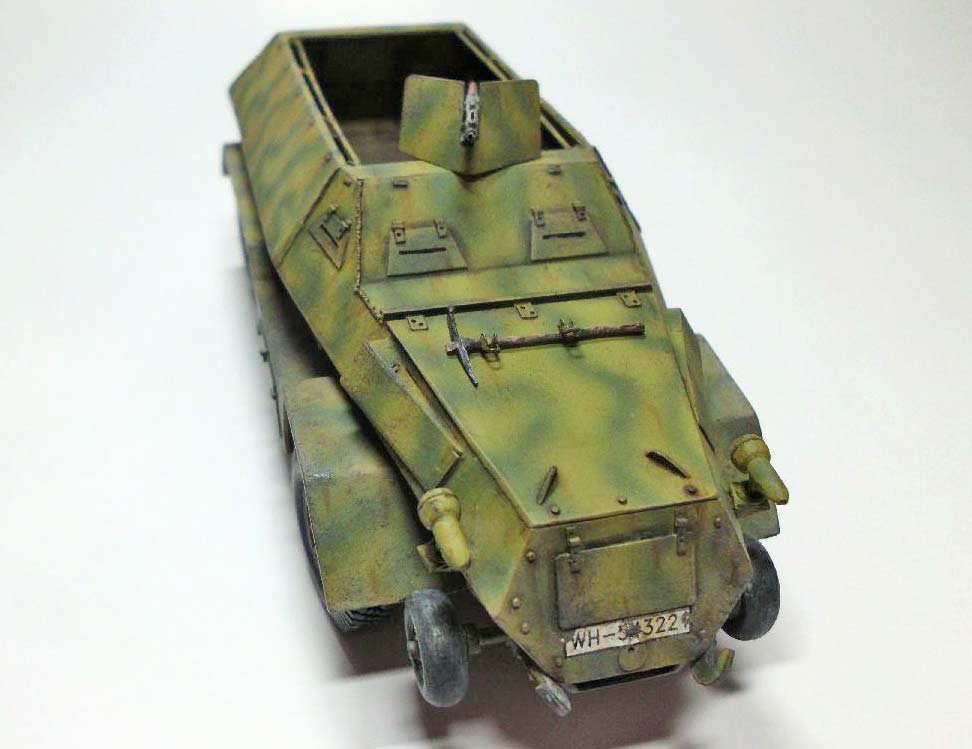 Ich habe mich für eine dunkelgelbe (MM 2095) Grundlackierung, auf die unregelmäßig grüne (MM2069) Tarnstreifen aufgetragen wurden, entschieden. Das Altern bewerkstelligte ich durch Unterlegen der Kanten und Vertiefungen mit dunklen Farbpigmenten der Firmen Kremer und MIG. Anschließend folgte der Auftrag einer Schicht matten Klarlacks (Xtra-Color) nebst 48 Stunden Trocknungszeit. Das punktuelle „Waschen“ nahm ich mit „Enamel Wash“ für deutsche dunkelgelbe Fahrzeuge AK 300 vor, Filter wurden mit diversen gelben, weißen und grünen Ölfarben gesetzt, die mit „White Spirit“ AK 047 in bzw. zu unterschiedlicher Intensität ausgezogen wurden. Dezente Rost- und Schmutzschlieren folgten nach gleicher Methode mittels „Rust streaks“ und „Streaking grime“ aus dem Set „Streaking effekts“ AK 062. Dreck- und Staubablagerungen innen wie außen brachte ich mit AK-Pigmenten („Light Dust“ AK 040 und „European Erth“ AK 042) auf, die mittels Pigment-Fixer AK 048 griffest gemacht worden sind. Zuvor gab es noch diverse Kratzer, Lackabsplitterungen und Roststellen, um einen „strapazierten“ Eindruck des Fahrzeugs darzustellen. Blanke Metallstellen entstanden durch Verwendung von dunklem Grafitpulver AK 086 . Bei den Beschriftungen beschränkte ich mich auf WH-Kennzeichen, die aber auf den zeitgenössischen Bildern nicht dokumentiert sind.