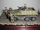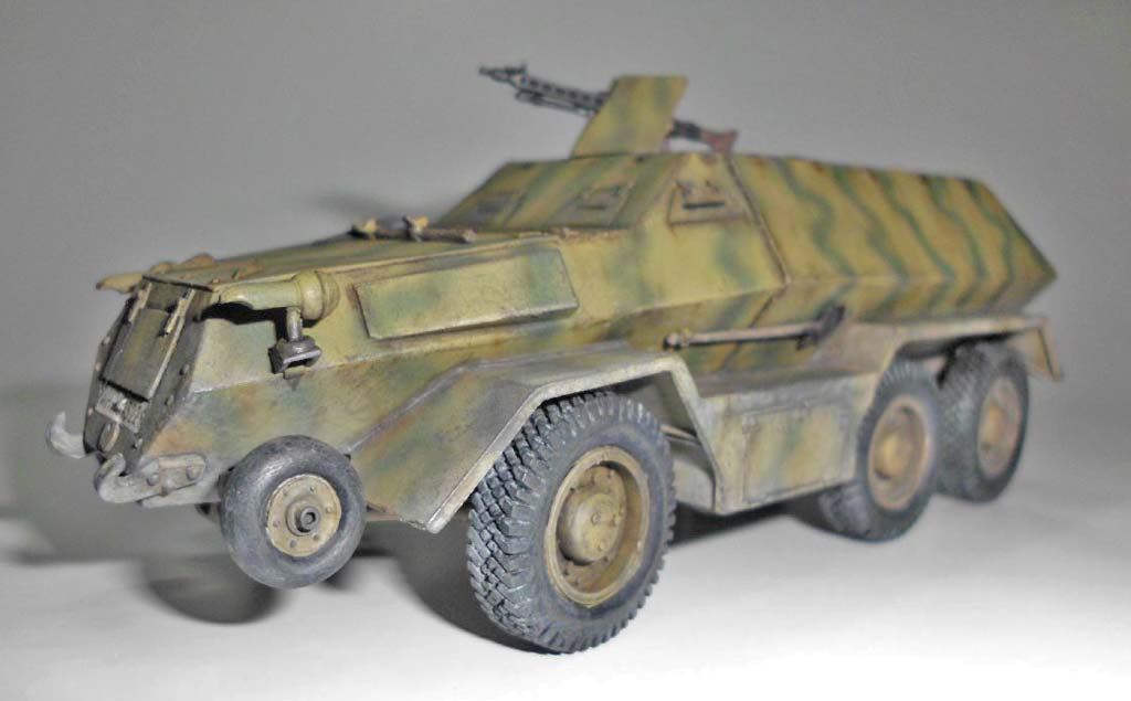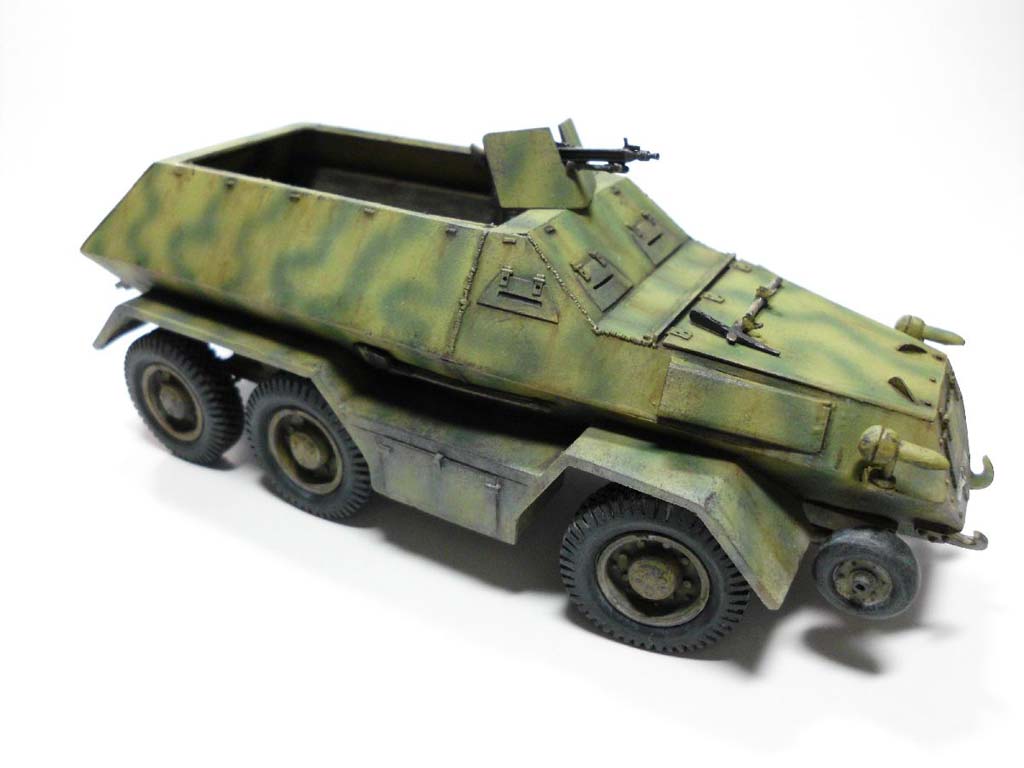Die in Frankreich sehr geschätzten Geländewagen der Firma Laffly entweder mit 2 oder 3 Achsen versehen verfügten grundsätzlich über Allradantrieb. Um das Überschreiten von Gräben bzw. Bodenwellen zu erleichtern, erhielten die meisten Fahrzeuge, auch die der Baureihe W 15 T, eine für die französische Armee gefertigte leichte 3-chsige Zugmaschine, vorne im Bereich der Stoßstange und zwischen erster sowie zweiter Achse kleine, vollgummibereifte Stützräder. Die Motoren stammten von Hotchkiss, wo aufgrund der geringen Produktionskapazitäten der Stammfirma ebenfalls Fahrzeuge nach Laffly-Entwürfen und Vorgaben produziert wurden. Dies ging so lange, bis Laffly von Hotchkiss wohl nicht recht überraschend - ganz übernommen wurde. Im Grunde war der W 15 T von der Serie S 15 T abgeleitet und die Fertigung lief erst 1940 bei Hotchkiss an, so dass möglicherweise Laffly von der Serie W 15 T nur Prototypen baute. Insgesamt dürften ca. 80 Exemplare ausgeliefert worden sein, wobei dazu noch 70 teilgepanzerte Selbstfahrlafetten mit der nach hinten schießend auf die Ladefläche montierten französischen 4,7 cm Pak kommen. Die von der Wehrmacht erbeuteten Fahrzeuge stellten aufgrund ihrer geländetauglichen und zuverlässigen Eigenschaften eine willkommene Beute dar. Sie fanden als Führungs- sowie Funk- bzw. Mannschaftswagen und leichte Zugfahrzeuge bspw. für Pak Verwendung. Für die sog. „Schnelle Brigade West“ baute man u. a. 24 Fernsprech-Kraftwagen um. Ebenso gab es eine gepanzerte Version mit einem dem SdKfz. 251 ähnlichen Aufbau und MG-Bewaffnung. Bekanntermaßen findet der interessierte Modellbauer primär die Fotos von 2 Prototypen, nämlich einmal mit 3 Achsen und zum anderen von einer zweiachsigen Variante. Für diese baute man die mittlere Achse aus und statt jener einen verlängerten Staukasten an das Chassis an. Lange Zeit fand sich kein Bildbeleg für einen Einsatz der wohl als Schützenpanzerwagen genutzten Fahrzeuge. Im Internet stellten manchen Diskussionsteilnehmer in den diversen Foren die Existenz sogar völlig infrage und meinten, dass es sich um Nachkriegsumbauten handele, die für Filmaufnahmen möglicherweise als miserabel dargestellte SdKfz. 251 dienen sollten. Nun, zwischenzeitlich konnten zumindest 2 Fotos vom Einsatz nachgewiesen werden. Beide sind im Internet zu finden, eines zusätzlich in dem Buch „Rückmarsch then and now“ auf Seite 172 unten links. Das zweite Bild zeigt ein Fahrzeug mit schemenhaft erkennbarem Tarnmuster auf einem großen Platz vor einem Brunnen. Im Gegensatz zu den Prototypen weisen diese gepanzerten W 15 T zumindest folgende Unterschiede auf: