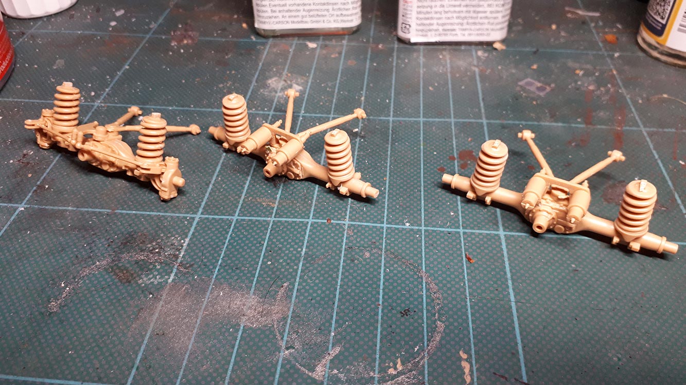 Der Einbau der Achsen ist ein bisschen tricky, denn hier müssen mehrere Bauteile zueinander passend eingeklebt werden und die Achsen am Ende alle exakt gleich ausgerichtet sein, wenn später nicht eines des Räder "hinken" soll.