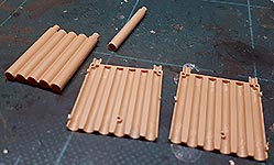 An der Unterseite des Werfergehäuses werden kleine Haken aus Spritzgussteilen angebracht, wobei hier zu beachten ist, dass die angezeichneten Passmarken leider falsch sind - ich habe die Passmarken entfernt und nach Augenmaß von Fotos die Haken neu positioniert.
