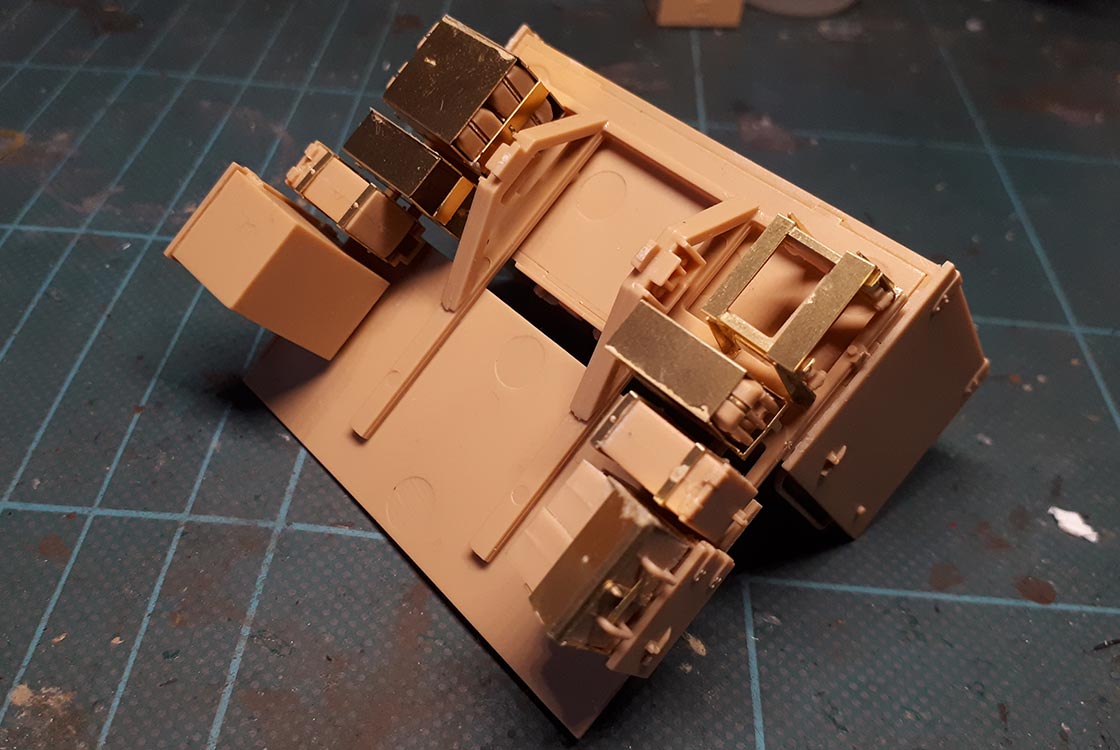 Die Werferplattform, die auf dem Chassisträgerrahmen aufgesetzt wird setzt sich aus wenigen Teilen und einigen PE Teilen zusammen. Der Zwischenboden zwischen dem Fahrerhaus und der Werferplattform trägt an der Unterseite haufenweise Halterungen und Staukisten, inklusive schönen Detaillierten Ersatzkanistern. Auf der Oberseite sind recht schöne Antirutschpads mit aufgespritzt - vielleicht eine Spur zu erhaben, aber schön dass sie da sind. Die große Staukiste an der Front, die direkt an der Rückseite des Fahrerhauses ansetzt ist einteilig und bereits mit recht schönen Details versehen. Hier werden lediglich ein paar Handgriffe und einige kleine PE Teile angebaut. Leider fehlt das darauf eigentlich befindliche Schanzwerkzeug, aber immerhin sind die leeren Halterungen dargestellt.
