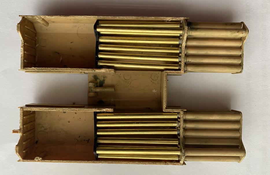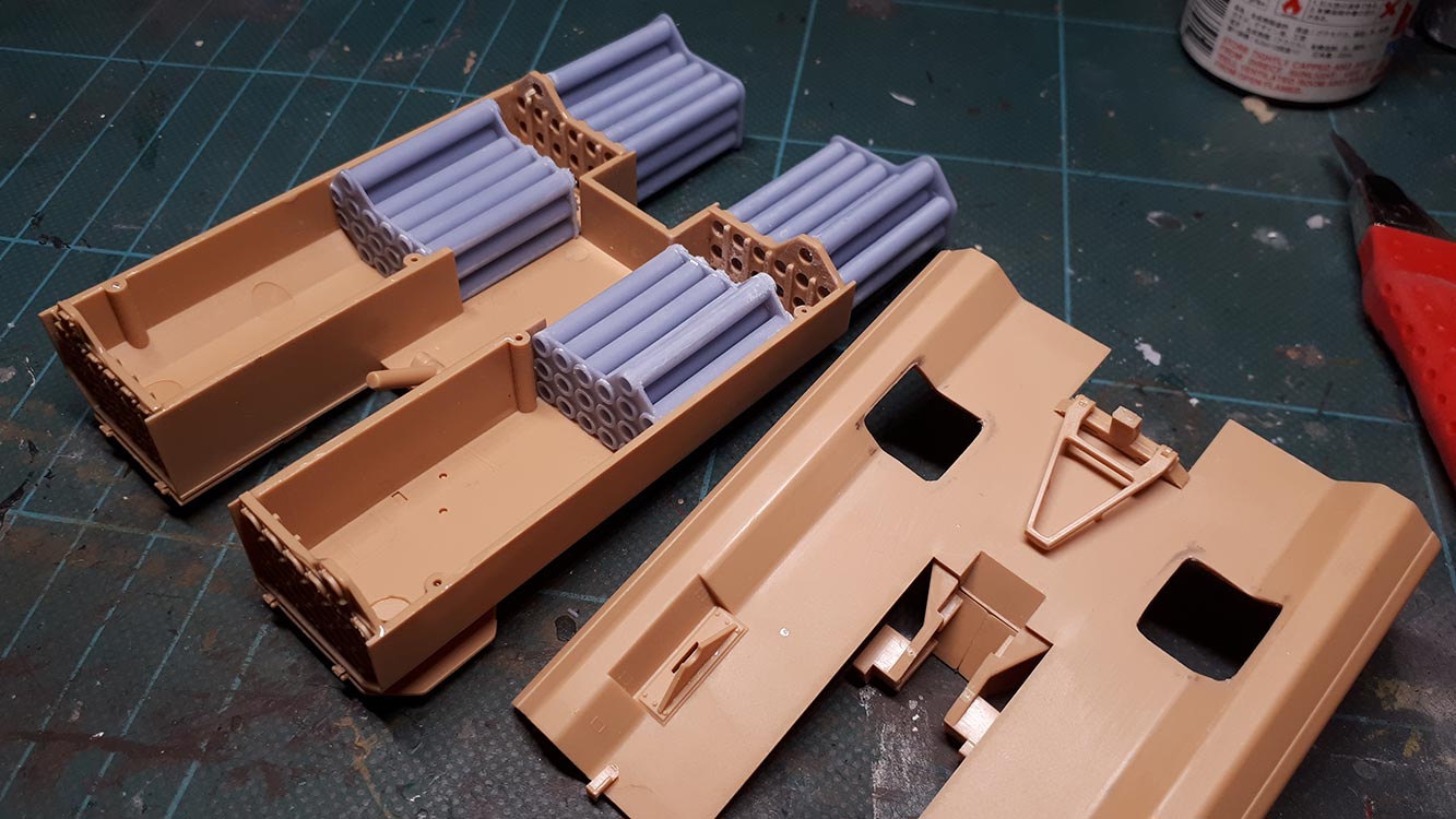 Was mich besonders "schockiert" hat, ist, dass die beiden recht großen Öffnungen auf der Werferunterseite im Gehäuse gar nicht dargestellt sind - und damit nicht genug, denn durch diese recht großen Öffnungen kann man die Rohre im Inneren sehen. Zwar fällt das nur auf, wenn der Werfer in erhöhter Feuerstellung dargestellt wird. Nach einigem grübeln kam mein Modellbaufreund Ingmar zur Rettung, denn er hat nicht nur die vorderen Werferrohre in einem Paket in perfekt getrennter Darstellung der Einzelrohre als 3D Druckteil erstellt, sondern auch die Rohrpakete für das Innere des Werfergehäuses, die man dann durch die neu zu schneidenden Öffnungen sehen kann.