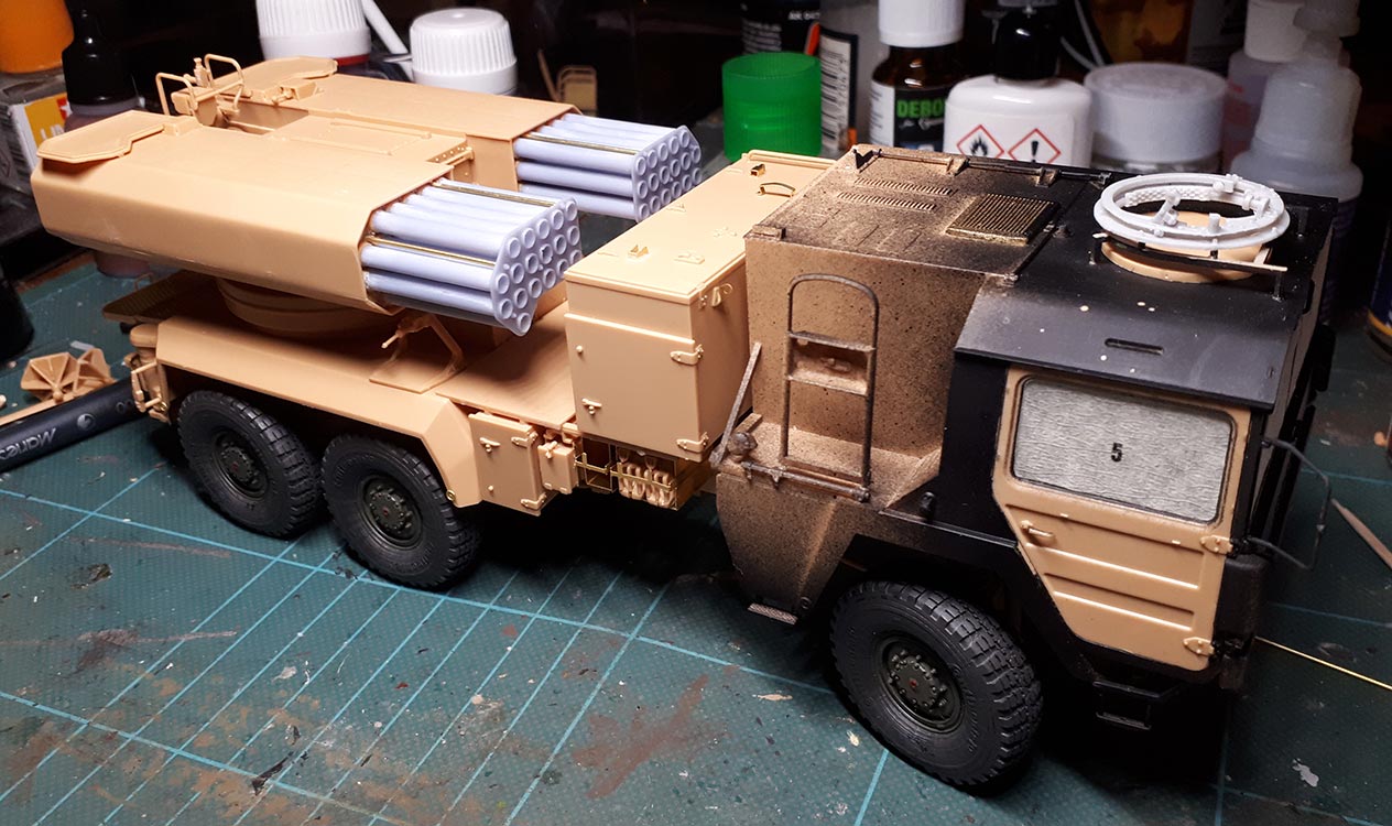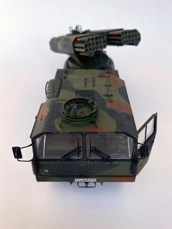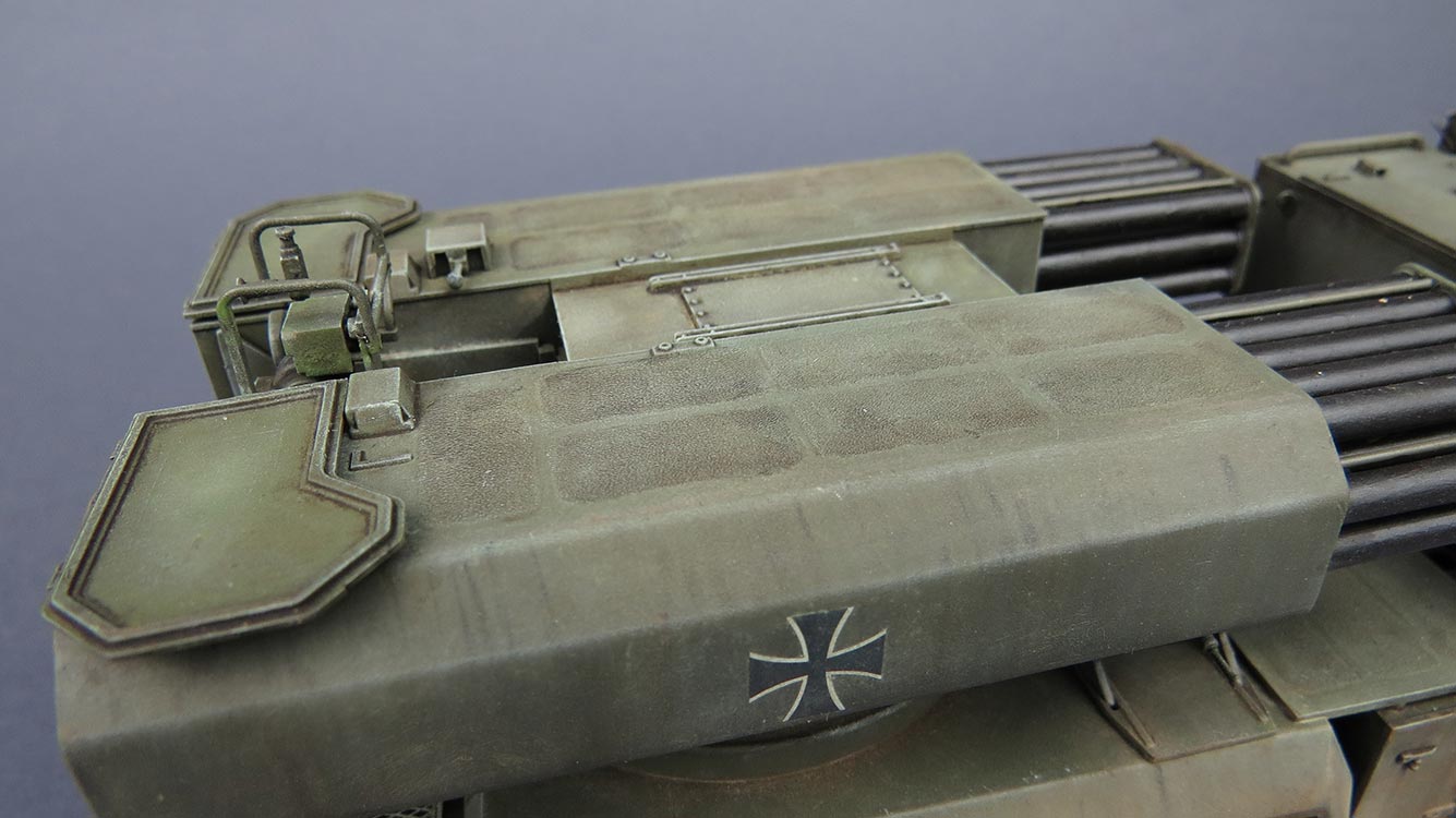 Ein weiteres Manko offenbart sich leider, wenn man den Werfer in erhobenem Zustand bauen will, denn am Original finden sich zwei recht große, markante Ausschnitte in der unteren Werferverkleidung hinter denen die inneren Rohrpakete sichtbar sind - das ist leider (weder das eine noch das andere) im Bausatz berücksichtigt - und meiner Meinung nach schwer nachzubauen.