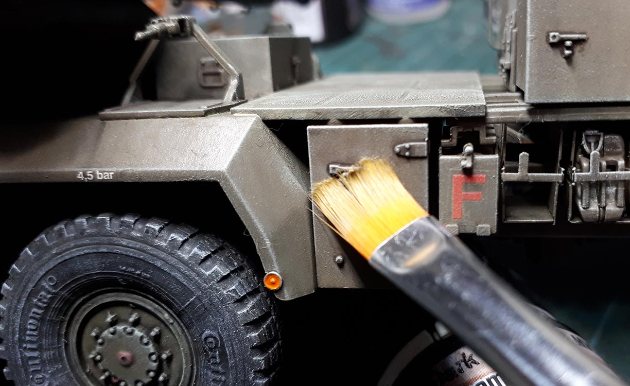 Ist dieser soweit durchgetrocknet kommt als nächstes ein Pinwashing mit AK-075 „Wash for NATO Camo Vehicles“ vor allem an Vertiefungen und Details wie Scharniere, Halterungen, Nieten etc., um dem Ganzen etwas Tiefe zu geben.