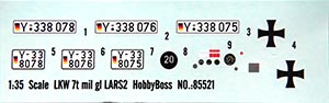 Etwas tricky ist es dann mit den Decals, denn das was Hobby Boss da mitliefert ist schon ein bisschen sehr mager, wenn nicht sogar eine Mogelpackung, denn es fehlen so wichtige Decals wie die "F" Markierungen der Feuerlöscher, jegliche taktische Zeichen, die Luftdruckangaben über den Reifen und auch das recht große und markante Ziffernblatt der Richtanzeige hinten am Werfer.