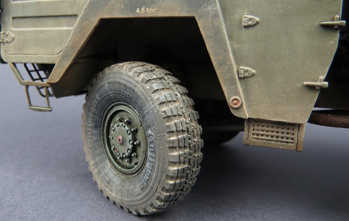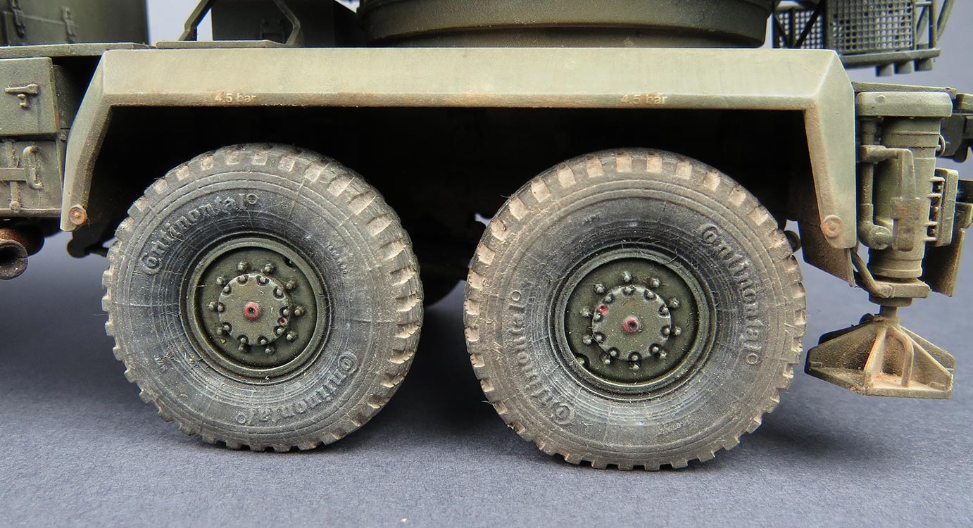 Die Reifen wurden mit Tamiya XF 69 Nato Black und XF 67 Nato Green farblich gestaltet; um hier eine entsprechende dezente Alterung zu erzeugen probierte ich mal was Neues.