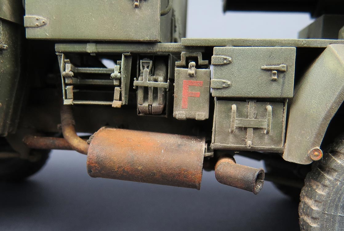 Der Auspuff und die Auspuffrohre habe ich zunächst in gun metal bemalt und dann mit verschiedenen Rostpigmenten feucht aufgetupft. Das Auspuffendstück wurde dann mit schwarzen Pigmenten behandelt.