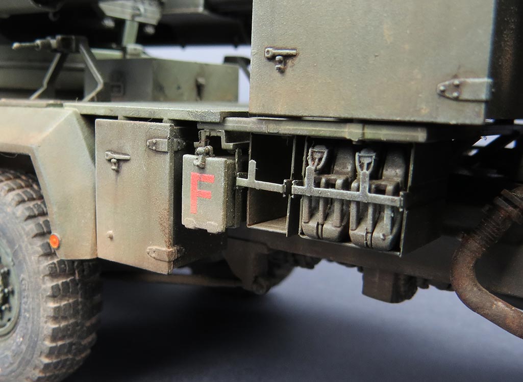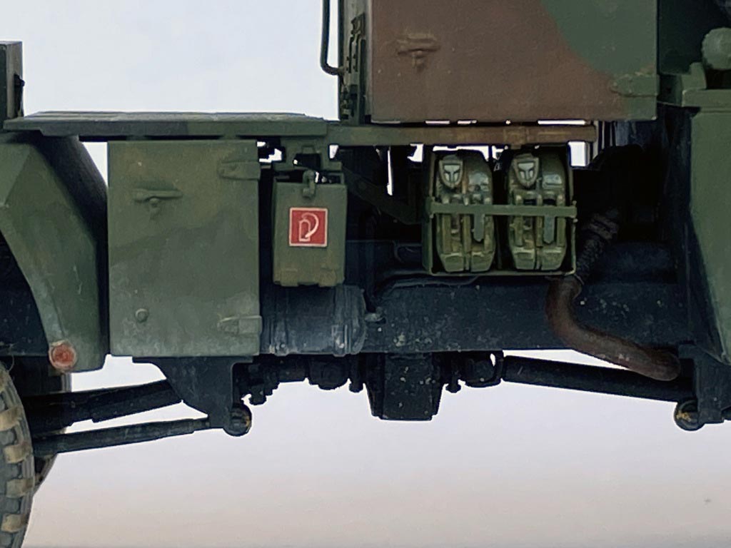 Die Hydraulikstützen am Heck, auf denen das Fahrzeug beim Abfeuern stabilisiert wird können entweder abgesenkt oder hochgezogen mit verstauten Bodenplatten gebaut werden. Die Versteifungsrippen der Bodenplatten sehen an sich gut aber etwas zu stark aus.