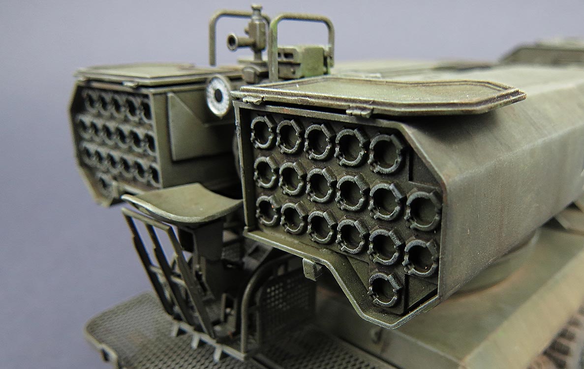 Doch jetzterstmal der Raketenwerfer an sich, da mich dieser am meisten reizt. Die vorn aus dem Werfergehäuse ragenden 36 Werferrohre hat Hobby Boss diese in Gruppen in je zwei Halbteilen beigelegt. Diese lassen sich tatsächlich relativ sauber zusammensetzen, sodass die Öffungen wirklich rund sind, ABER verglichen mit dem Original gibt es hier massig Defizite. Denn die Rohre sind an sich einzeln und nur vorn durch die Abschlussplatte verbunden und nicht wie bei den Bauteilen durchgängig.