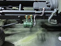 Da auf Originalfotos wunderbar leuchtend dargestellt brachte ich an den Reifen und den Getriebeölschrauben rote und an den Verschraubungen der Stabilisatoren, den Befestigungen der hinteren Abschleppvorrichtung und den Schrauben des Lenkgestänges gelbe Farbtupfer auf. Ebenso gestaltete ich erst jetzt die Anschlüsse der Bremsleitungen am Heck des Fahrzeugs mit den gleichen Farben. In diesem Zusammenhang fiel mir jedoch noch ein großes Manko auf: Auf Vorbildfotos sind an der hinteren Achse 2 rote Rückstrahler. Was mich geärgert hat ist, dass diese zwar als Ätzteile vorhanden sind, die Bauanleitung sich allerdings nirgends darüber auslässt. Und den vorderen Anschluss der Bremsanlage (benötigt man, wenn das Fahrzeug abgeschleppt werden muss und keinen eigenen Druckaufbau mehr gewährleisten kann) habe ich, weil’s eh schon Wurscht war, ebenfalls noch aus einem modifizierten Kanisterdeckel und 0,7 mm Bleidraht improvisiert.