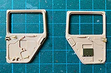Wo man auch noch nacharbeiten sollte, sind die Seitenscheiben der Türen, denn das Original hat geteilte Scheiben zum Schieben, während im Bausatz eine durchgehende Scheiben enthalten ist. Diese Schiebescheiben realistisch darzustellen wäre etwas aufwändiger, aber die Optik wird schon alleine dadurch verbessert, dass man die beiden Scheiben vertikal mittig ein wenig anritzt um eine Teilung zu suggerieren.