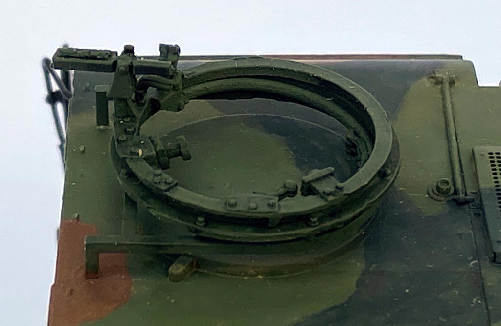 Die Werferunterlafette baut auf einem mehrteiligen runden Drehkranz auf, der drehbar bleibt. Die Anbauteile zur Aufnahme der Werfer, des Richtschützensitz' und der Richtaufsatz nebst Handrädern sind gut und detailliert dargestellt.