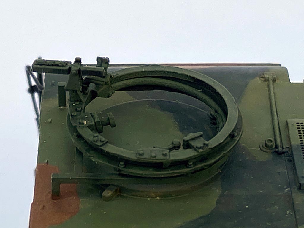 Etwas ärgerlich ist hier die Darstellung der Lafette für das Fla-MG, denn Hobby Boss hat hier nur das Untergestell im Bausatz - der Drehring mit sämtlichen Anbauteilen und MG fehlt komplett. Hier habe ich auf das Resin-Set von Perfect Scale (Nr.35160) zurückgegriffen, das mit schönen Teilen hier wichtige Details zum Modell hinzufügt - die Bauanleitung indes kann einen schier zur Verzweiflung treiben, da gerade bei den Kleinteilen kaum erkennbar ist welches wo genau sitzen soll. Auch der Aufsatz auf das Gestell von Hobby Boss ist nicht ganz klar - offenbar müssen die winzigen Stifte abgetrennt und neu arrangiert angeklebt werden, wobei mir nicht klar ist, warum man diese nicht gleich korrekt positioniert an die Unterseite des Drehrings mit angießt!?