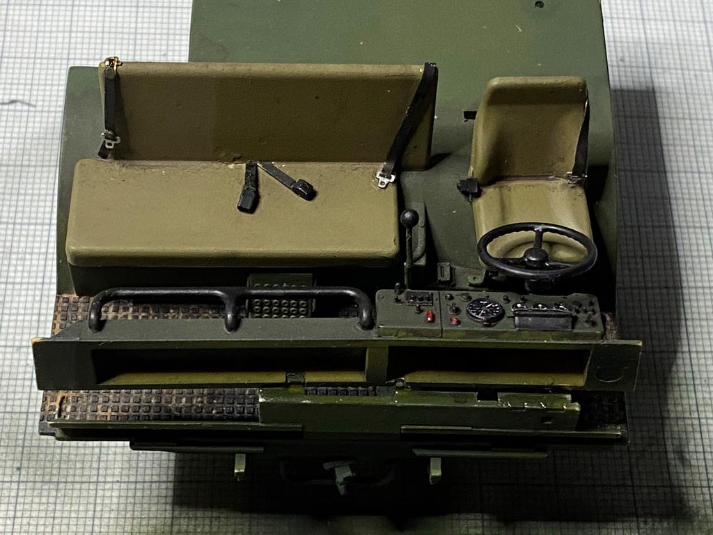 Die Trittstufe ließ ich eingeklappt, am Fahrersitz und auf der Sitzbank ergänzte ich die Sicherheitsgurte von Perfect Scale, da man durch die großen Frontscheiben einen Einblick aufs Innenleben hat.
