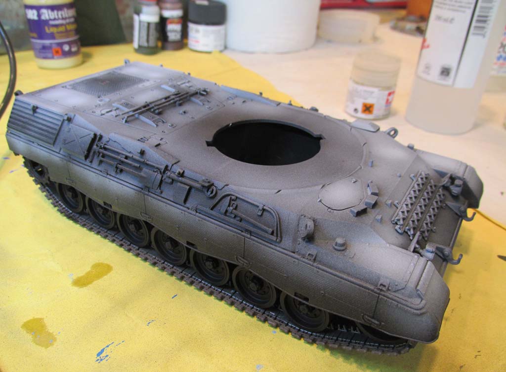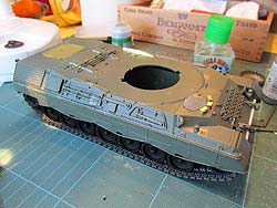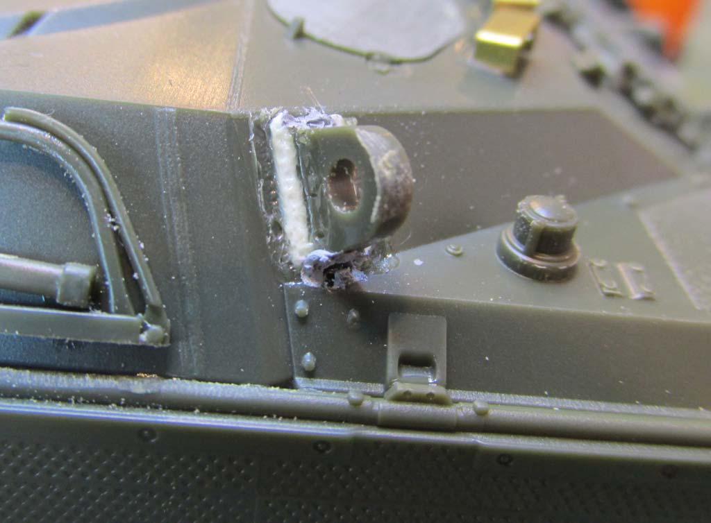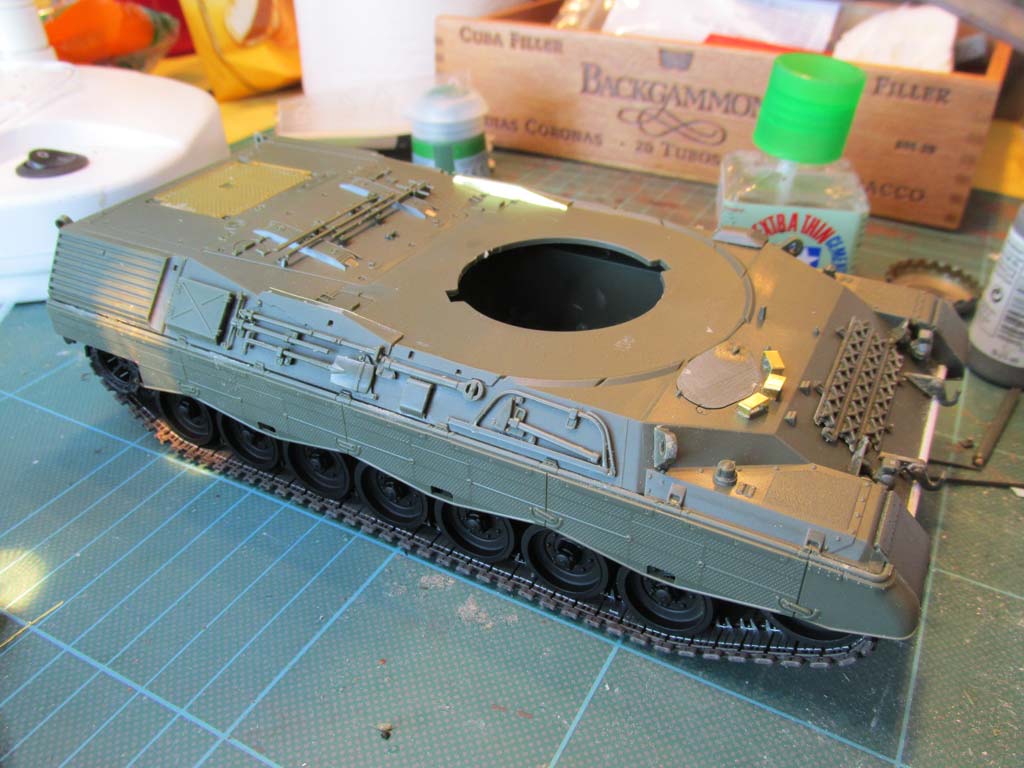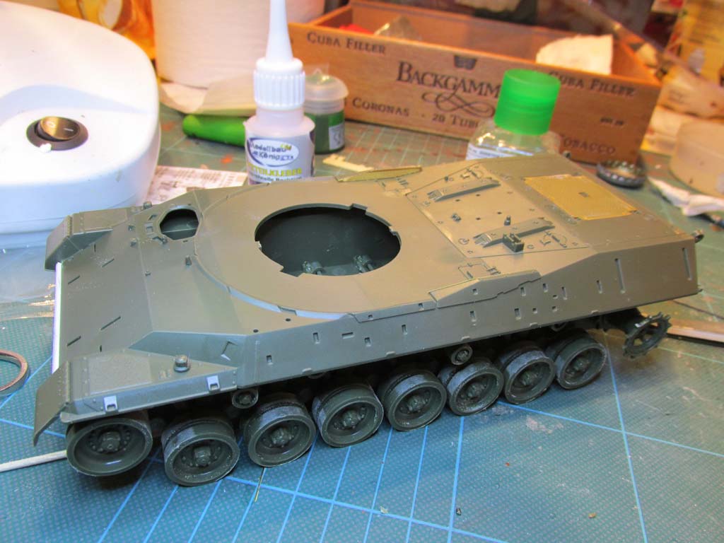 Mit dem Einkleben der Heckwand in die Unterwanne kann man auch gleich die Oberwanne aufkleben. Die Passgenauigkeit ist hier einfach grandios - keine Spalten, kein Verzug, einfach wunderbar. Ich habe an dieser Stelle vorn an der Bugplatte die Unterwanne um rund einen Millimeter verlängert, da im Original die Unterwanne etwas über die Oberwanne ragt, wenn auch nur wenig. Das war im Modell nicht berücksichtigt. Fand ich jetzt auch nicht dramatisch schlimm, aber da mir gerade das exakt passend dicke quadratische Plastikprofil vor der Nase lag, habe ich das nachgearbeitet. Waren 2 Minuten Arbeit mit ein wenig Flüssigspachtel und Schleifen um das Ansatzstück absatzfrei einzuarbeiten. Bei der Gelegenheit sollte man, wenn man frühe Leopard 1 A3 darstellen will, die Fahrerwinkelspielgelreinigungsdüsen auf der Oberwanne abtrennen und verschleifen. Ich habe mich für ein spätes Modell entschieden und habe die Düsen drangelassen.
