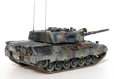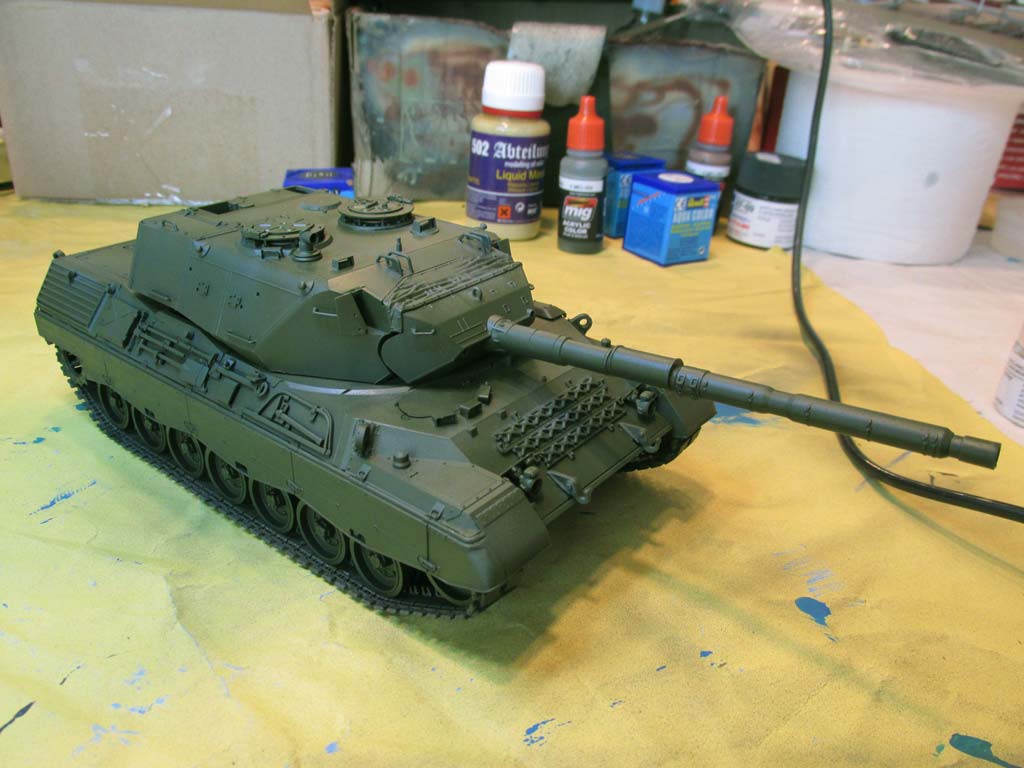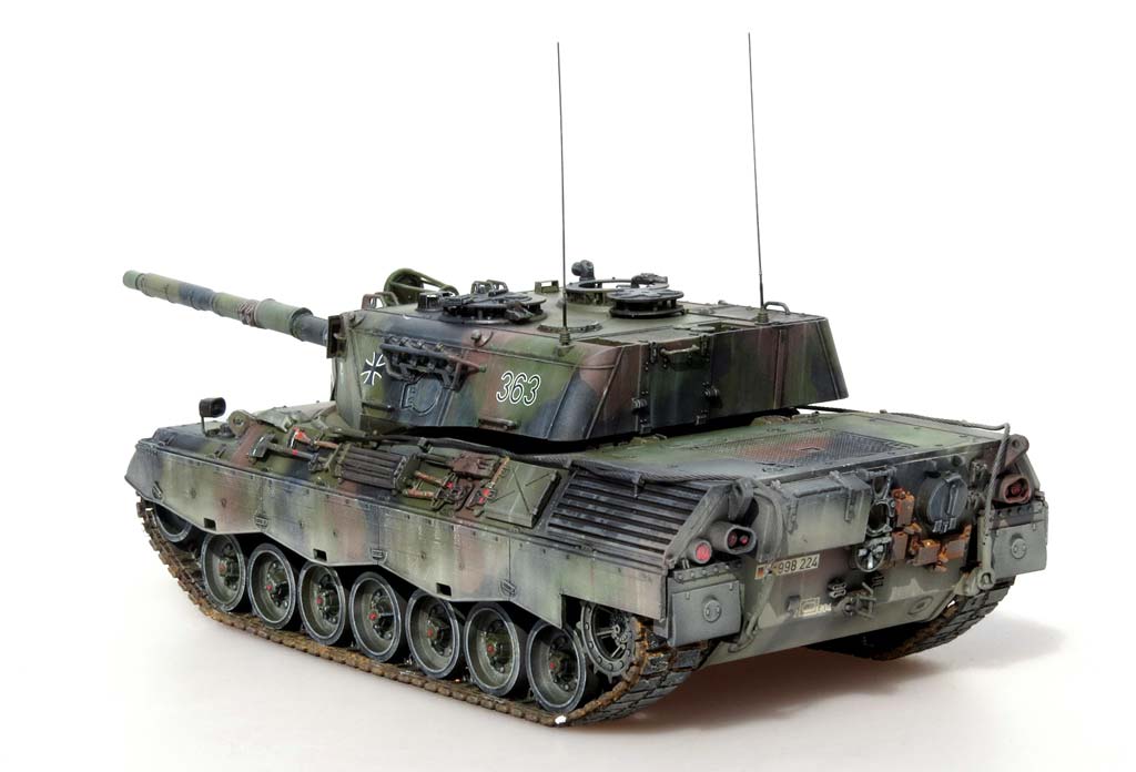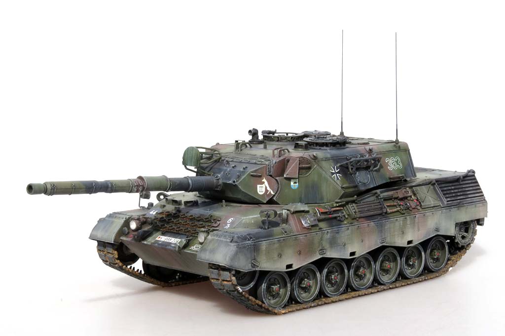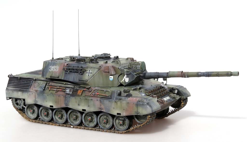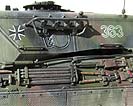 Im Karton finden wir 19 Spritzlinge, ein Spritzling mit Klarsichtteilen, Oberwanne, Unterwanne, Vinylketten, Polycaps, PE Teile, Seilmaterial und ein Decalbogen. Bei der ersten Durchsicht der Teile machen diese am Spritzling einen guten Eindruck und Probeschnitte mit dem Modellbauseitenschneider zeigen kein zu sprödes Plastik wie es in einigen Foren zu lesen war - hier ist denjenigen vielleicht mal ordentliches Werkzeug anzuraten. ;-) Die Qualität der Teile ist ganz ausgezeichnet mit guten Details, keine Fischhäute und keine Auswerferstellen, zumindest nicht dort wo sie sichtbar wären oder stören würden, außer auf den Einzelgliedketten. Der Bausatz beinhaltet alles was man für den korrekten Bau eines Leopard 1 A3 oder eines A4 benötigt mit den entsprechend korrekten Ausführungen des 5. und 6.Bauloses - man hat seitens Mengs sogar an Schießscheinwerfer und das PZB200 gedacht. Doch der Reihe nach ... Die Unterwanne macht einen schönen Eindruck mit frei einsteckbaren und beweglichen Schwingarmen an Drehstäben. Endanschläge und Stoßdämpfer werden einzeln angeklebt und sind etwas vereinfach aber ganz ok, vor allem wenn man bedenkt wieviel man davon später hinter den Laufrollen und Schürzen davon noch sehen wird. Ähnlich ist es mit dem Wannenboden - hier hätte man sicher noch bessere Details darstellen können, aber ernsthaft ... wer schaut später unter das Modell? Für die Kette hat Meng sowohl eine Einzelgliedkette und Vinylketten beigelegt. Damit kann jeder nach seiner Fasson glücklich werden. Die Einzelgliedkette liegt mit je drei Angüssen pro Glied im Spritzling vor und hat leider auf der Innenseite zwei Auswerferstellen - auch hier sieht man später nicht mehr viel von, aber trotzdem unangenehm. Die Details sind sowohl auf der Innen als auch Aussenseite recht schön, wennauch die Gummiinlays auf der Innenseite vereinfacht dargestellt sind. Dies gilt auch für die Vinylkette, die aber dafür keinerlei Auswerferstellen hat und ansonsten auch für eine Vinylkette wahnsinnig gut und fein detailliert ist - gerade dass die einzeln Glieder korrekt durchbrochen sind, macht die Vinylkette zu einer lohnenswerten Wahl. Man muss sie allerdings noch erst etwas bändigen, denn durch die Lagerung im Karton sind meine krumm wie ein Lämmerschwanz. Die Oberwanne macht ebenfalls einen guten Eindruck, wobei die im Original markanten, teils mehrschichtigen Schweißnähte ein wenig unterdimensioniert erscheinen. Die Öffnung des Motorlüfters wird von unten mit einem sehr schön gemachten Plastikteils mit der Wabenstruktur des Leo 1 Lüfters versehen und es liegt sogar das passende Teil für das Tropenkit wie beim griechischen Leopard bei. Das Motorgitter selber ist aus sehr feinem PE Blech, sowohl für den Standard als auch den Tropenkit Leopard. Die Auspuffgrätings mit Strangpressprofil werden als einzelne Bauteile auf die Oberwanne aufgebracht - aber die Machart ist gar nicht nach heutigem Standard, denn diese besitzen nahezu keine Tiefe - das ginge heutzutage mit Sicherheit besser. Kommen wir zum Turm. Dieser entspricht in den Dimensionen und Winkeln perfekt dem Schweißturm der A3 und A4 Version, auch im unteren Bereich wo der Italeri Turm vollkommen verkehrt war. Aber auch hier am Turm erscheinen die Schweißnähte ein wenig zu unterdimensioniert. Das Kanonenrohr mit Wärmeschutzhülle ist aus zwei Halbteilen mit extra einteiliger Mündung dargestellt. Diese weist im Inneren Felder und Züge auf. Auf der Kanonenblende können wahlweise der Schießscheinwerfer und/oder das PZB200 in seinem Käfig aufgebaut werden. Die Bauanleitung zeigt in 23 Bauschritten den Zusammenbau des Modells. Die Zeichnungen sind sehr gut und vor allem übersichtlich mit klaren Teilepositionierungen. Wahlteile wie etwa für die Teile von A3 und A4 werden explizit dargestellt und entsprechend erläutert. Dazu gibt es mehrseitige Infos in mehreren Sprachen zum Originalfahrzeug, Bastelhinweise und eine Teileübersicht. Auf vier farbig gedruckten Seite wird die Bemalung und Markierung von 4 Versionen und eine Farbtabelle mit Vallejo Farbtönen. Die mit der Bemalungsanleitung und Decalbogen möglichen Versionen sind: - Leopard 1 A3, 2./PzBtl.304, Mitte 80er Jahre in Dreifarbtarnung - Leopard 1 A3, 4./PzBtl.301, 80er Jahre in gelboliv - Leopard 1 A4, 3./PzBtl.293, 80er Jahre in gelboliv - Leopard 1 A4 GR in Vierfarbtarnung .