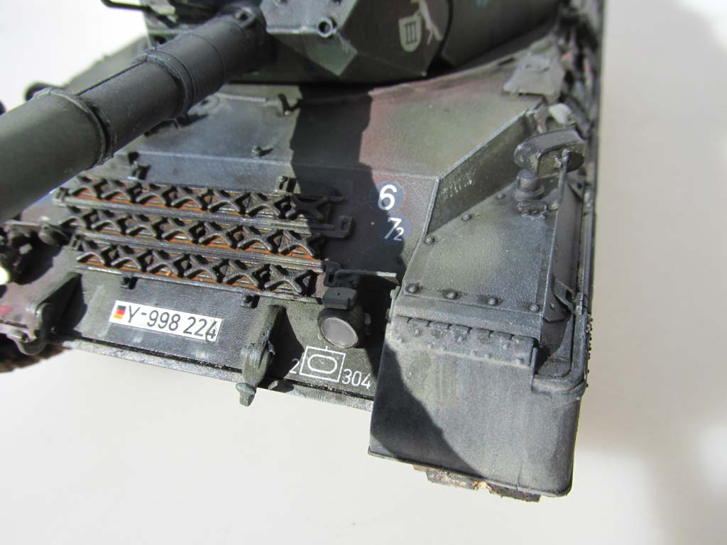 Dann werden also die Seitenschürzen angeklebt. Die Optik dieser ist wirklich beeindruckend, zumal man an solche Sachen wie unterschiedliche Stellungen der Sicherungshebel zwischen den einzelnen Elementen gedacht hat. Schade ist, dass man die Elemente nicht einzeln hat, um diese entweder wegzulassen oder einzeln hochzuklappen. Etwas befremdlich ist auch, dass das vorderste Stück, ein Teil des vorderen Schmutzfängers darstellt. Die Befürchtung, dass man nun unfassbar hässliche Spalten am vorderen Ende seines Leopards hat, ergibt sich nur, wenn man die Schürzen unfassbar ungenau anbaut. Ansonsten bekommt man hier nämlich nur eine feine Naht, die mit etwas schleifen fast unsichtbar gemacht werden kann. Wie gesagt - man hätte es werksseitig besser lösen können, aber die sehr exakte Verarbeitung gibt einem die Möglichkeit es trotzdem gut hinzubekommen. Als nächstes werden massenhaft Werkzeuge und Anbauteile an die Oberwanne gebracht. Vorn die Eisgreifer, die in einem Stück mit Halterungen daherkommen, an den Seiten die ABC Hutze, Werkzeuge, Rohrreinigungsstangen, sowie Heissösen und Auspuffgrätings. Letztere sind leider mit etwas flachen Vertiefungen dargestellt - das hätte man mit Sicherheit besser machen können, aber auch hier sehe ich kein unüberbrückbares Problem, denn mit einem ordentlichem, dunklen washing am Ende kann man die fehlende Tiefe herausarbeiten.