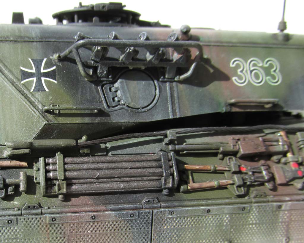 Die Halterungen für das Anschleppseil sind wahnsinnig fein aus Plastik. Hier muss man sehr vorsichtig beim Heraustrennen, versäubern und ankleben per Pinzette sein, damit diese nicht dem Teppichmonster anheimfallen. Ich musste hier tatsächlich sowohl die Teile als auch die Zeichnung in der Bauanleitung mittels Lupe begutachten um genau auszumachen in welcher Ausrichtung diese aufgeklebt werden müssen. Ging dann aber ganz ausgezeichnet. Das Abschleppseil soll mittels Textilfaser dargestellt werden - ich habe dies aber gegen wunderschöne Kupferlitze von SKP getauscht. Was ich übrigens sehr empfehlen kann, ist diese Kupferkabel in der Messingbrünierung von Uschi von der Rosten schwarz zu färben. Geht 1a und der entstehende Metallton erübrigt eine weitere Bemalung. Am Wannenheck werden die Schmutzfänger und T-Zughaken angebaut. Ich habe mich bei den Schmutzfängern für die hochgeklappten entschieden, denn diese sind endlich mal erfrischend anders. Die hinteren T-Zughaken habe ich andersherum eingebaut um das Abschleppseil realistisch einhängen zu können. Damit ist die Wanne quasi komplett und wir wenden uns dem Turm zu. Entsprechend sollte man dann die Anbaumarken auf der Blende entfernen und die Stromanschlussstelle auf dem vorderen Turmdach - das wird in der Anleitung leider unterschlagen. Wer auch den Schießscheinwerfer weglassen will, braucht aber die Basishaken für den Anbau. Die hat Meng leider nicht im Bausatz und man muss sich da aus dem Scheinwerfergestell ein bisschen was zurechtschneiden. Das Kanonenrohr besteht aus zwei Halbteilen und der Mündung als Einzelteil. Da die Wärmeschutzhülle im Original auch Längsnähte hat und diese sehr minimal ist, kann ich ausnahmsweise an dieser Art tatsächlich mal nicht unbedingt etwas aussetzen, wennauch es anders sicher netter gewesen wäre. In das Turmoberteil wird von unten das Klarsichtplastikteil für die Kommandantenwinkelspiegel eingesetzt und hält quasi ohne Kleber! Das Kanonenrohr wird in die Blende eingeklebt und dieses auf eine höhenbewegliche Halterung, die im Turm sitzt. Leider nutzt diese Beweglichmachung nichts, denn in einem späteren Schritt wird die Deckplane zwischen Blende und Turm als starres Plastikteil eingeklebt und fixiert die Blende mit Rohr damit. Aber optisch sieht das ganz toll aus. Überhaupt passen Ober-, Unter- und Heckteil des Turms so gut und leicht zusammen, dass es eine Freude ist. D Da ich eine späte A3 Version baue, bleibt dies erhalten und es wird natürlich die Nahverteidigungswaffenabdeckung hinter der Ladeschützenluke angebaut und nur das kleine Periskop H25 vorn rechts angebaut. Die Abdeckungen der Winkelspiegel werden aus PE Teilen gebogen, was ohne große Probleme geht. Die Antennensockel nehme ich nicht aus dem Bausatz, sondern die Komplettantennen aus Messing von Schatton.