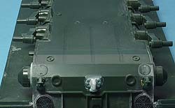 Die Nebelwurfbecher sind eigentlich ganz gut, aber leider haben in der unteren Reihe nur die beiden hinteren eine sichtbare Fächerung. Allerdings ist die Ausstellung beim zweiten von vorne auch am Original so unmerklich, dass es kaum stört. Die Kettchen stammen wieder von Eduard und wurden mit Weißleim angeklebt. Das lässt mehr Zeit zum Ausrichten und die Verbindung ist nicht so spröde und empfindlich wie bei Sekundenkleber.