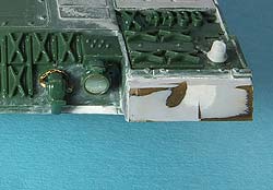 Auf dem Motordeck wurden alle Werkzeughalterungen plan geschliffen und sämtliche Griffe auf der Wanne durch welche aus Draht ersetzt. Die neuen Halterungen stammen alle von Eduard mit einer Ausnahme. Die Ösen für den Schraubenschlüssel und die Spitzhacke wurden selbst gebogen, da die Eduard-Teile die falsche Form aufwiesen. Das Hebegeschirr ist ebenfalls sehr grob. Es wurde zurechtgefeilt und erhielt ein fein gedrilltes Drahtseil. Apropos Drahtseil. Die Vinyldinger für die Abschleppseile aus dem Bausatz sind einfach nur grauenhaft, hier kam stattdessen 1mm starke Kupferlitze mit Kauschen von Perfect Scale zur Anwendung. Richtig hässlich sind außerdem am Modell die Luftfiltereinlässe. Auch hier bringen die Eduard-ätzteile eine deutliche Verbesserung.
