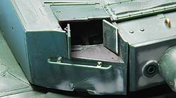 Weiter zum Turmheck. Dem kleinen Bürstenkasten, der unter der Halterung für die Feldkabeltrommel befestigt ist, fehlen links und rechts die Verstärkungsrippen. Etwas gezogener Gießast schafft Abhilfe. Die Verschlüsse müssen nicht zwangsläufig ausgetauscht werden, aber da ich schon dabei war. Eine Feldkabeltrommel sucht man übrigens im Bausatz vergeblich, sie findet sich aber auf der Eduard-Platine. Rechts angeordnet ist der faltbare Tiefwatschacht mit Befestigung. Später fand ich den könnte man noch etwas verfeinern, aber an diesem Modell habe ich ihn bis auf eine zusätzliche Öse belassen wie er ist. Die Plane, welche den Staukasten abdeckt, sieht nicht sehr realistisch aus. Ich habe sie ausgesägt und das innere des Turmstaukorbs teilweise nachgebaut. Das Tarnnetz ist eine eingefärbte Mullbinde und die Schlechtwetterplane wurde aus Green Stuff modelliert. Von den Antennenfüßen wurden die Grundplatten abgezwickt und in die Turmoberseite eingeklebt, dann wurde das Ganze für die Aufnahme von gedrehten Messingantennen von Schatton vorbereitet. Im näheren Umfeld wurden alle Ösen und Griffe ebenfalls aus Draht neu gestaltet. Die Schraubenköpfe seitlich am Turmheck haben gussbedingt eine seltsame Tropfenform. Einmal mit der Feile darüber gegangen verbessert ihr Aussehen merklich. Außerdem erhielt die Feldkabelbuchse links noch ein winziges Kettchen aus dem Sortiment von Royal-Model. Die Lüftungsöffnungen im Bereich der Kommandantenkuppel erhielten fotogeätzte Gitter (die Orientierung muss „x“ sein, nicht „+“ wie ich es zuerst hatte). Die beiden Stifte, auf denen die Kommandantenluke im geöffneten Zustand ruht, erhielten mit der Feile jeweils eine Stufe. Bei der Ladeschützenluke fehlt rechts hinter dem Luk eine Öse für die Arretierung. Die angegossenen Federn wurden entfernt und durch aufgewickelten Draht ersetzt. Beim Öffnungsmechanismus hat es Revell gut gemeint, ihn aber völlig falsch dargestellt. Der Hebel ist in der Mitte der Ladeschützenluke gelagert, nicht rechts am Rand. Leider krankte die Ringlafette an ein paar schlecht ausgegossenen Stiften. Diese wurde abgezwickt, aufgebohrt und gezogener Gießast eingesetzt. Bei den beiden großen Hebeösen hinter den Luken empfehle ich die Bausatzteile mit dem Seitenschneider so abzuzwicken, dass sich ein U ergibt und den Zwischenraum mit Spachtelmasse zu füllen. Müsste ich das Modell nochmal bauen würde ich hier außerdem noch Schweißnähte ergänzen.