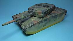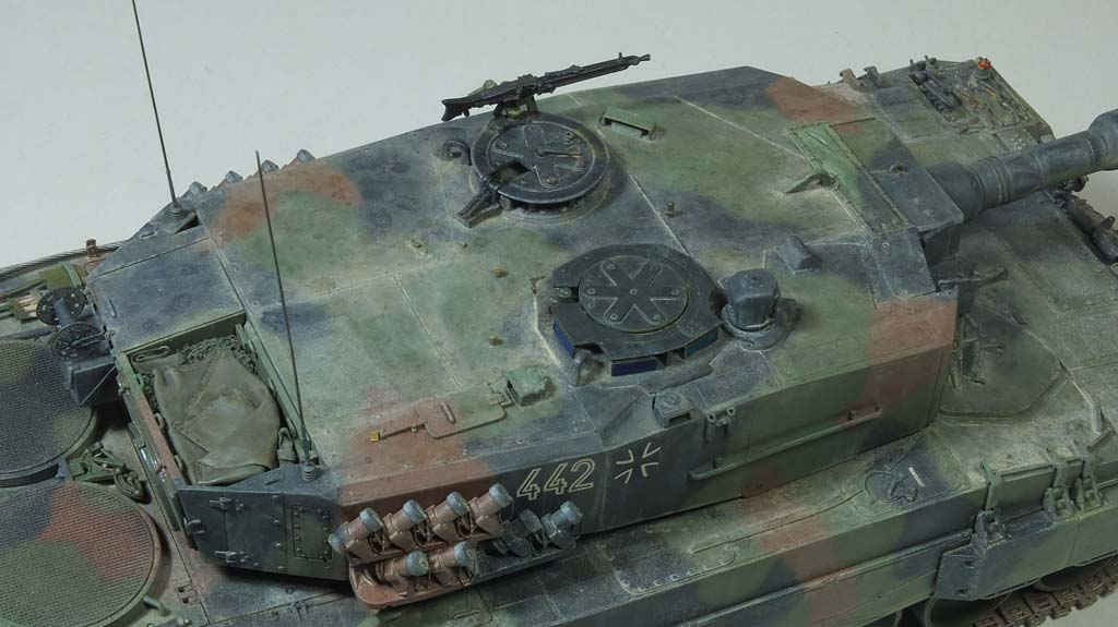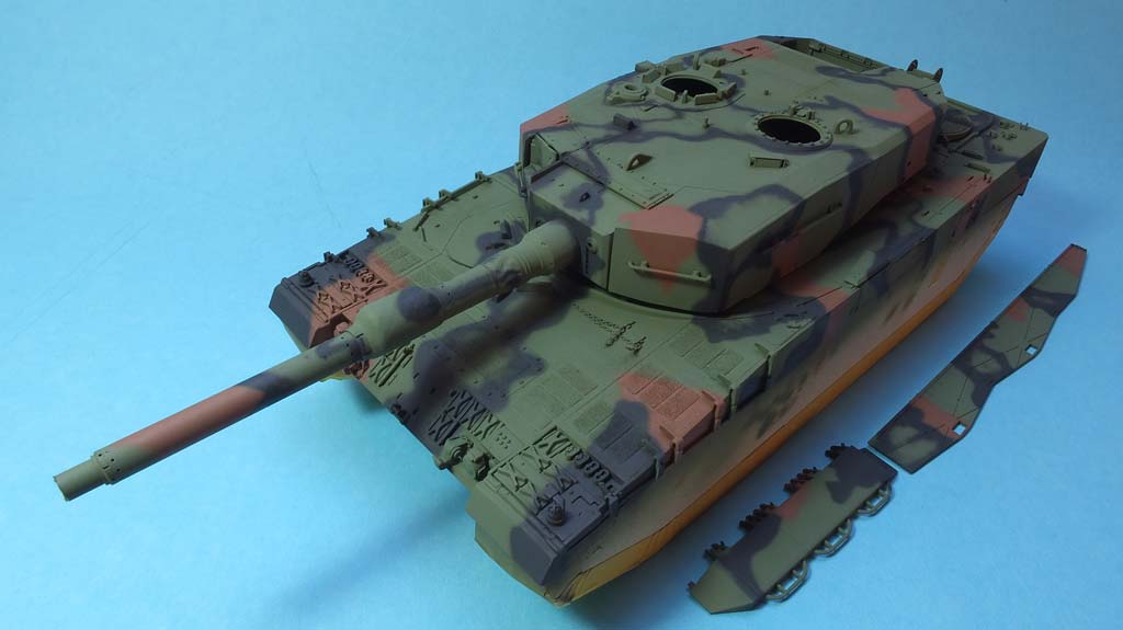 Was soll man über diese Ikone der Panzertechnologie noch schreiben, was so nicht schon irgendwo anders in ähnlicher Form steht? Vielleicht, dass ich zu diesem Fahrzeug eine besondere Beziehung habe, seit ich ein kleiner Junge war? Mir gefällt wahrscheinlich auch deswegen der Leopard 2 in seiner ursprünglichen Formgebung, also bis Version A4, am besten. Denn so kenne ich ihn einfach persönlich. Als der Fuhrpark der Bundeswehr noch gelboliv war, bin ich oft auf ihm herumgeklettert und ich wusste, dank meines Vaters schon mit sechs, dass er 1500PS hat, was fast dem Doppelten seines Vorgängers entspricht. Wenn meine Mitschüler Autos auf Papier gekritzelt haben, fuhren bei mir Leoparden durchs Gelände, mit Antennen die sich nach hinten bogen und immer mit einer großen Rauch- und Staubfahne am Heck. Und durch den Modellbau hat mich das Raubtier bis heute nicht mehr aus seinen Fängen gelassen, keinen Panzer habe ich öfter gebaut. Erst in 1:87, später 1:35. Nach der jüngsten Auffrischung kenne ich sein Fleckenkleid wieder fast auswendig. Man muss ihn einfach erlebt haben, idealerweise indem man selbst einmal mitgefahren ist, um die „Faszination Leopard“ nachvollziehen zu können. Also spare ich mir mal die technischen Details oder die Entwicklungsgeschichte und verweise lieber auf Wikipedia sowie die Fachliteratur. Stattdessen nutze ich hier die Gelegenheit Herrn Werner Huber von KMW in München dafür zu danken, dass er sich die Zeit dafür genommen hat mir bei der Klärung einiger Detailfragen zu helfen, die allein anhand meiner Unterlagen sonst nicht oder nicht eindeutig zu beantworten gewesen wären.