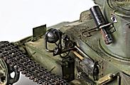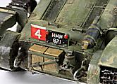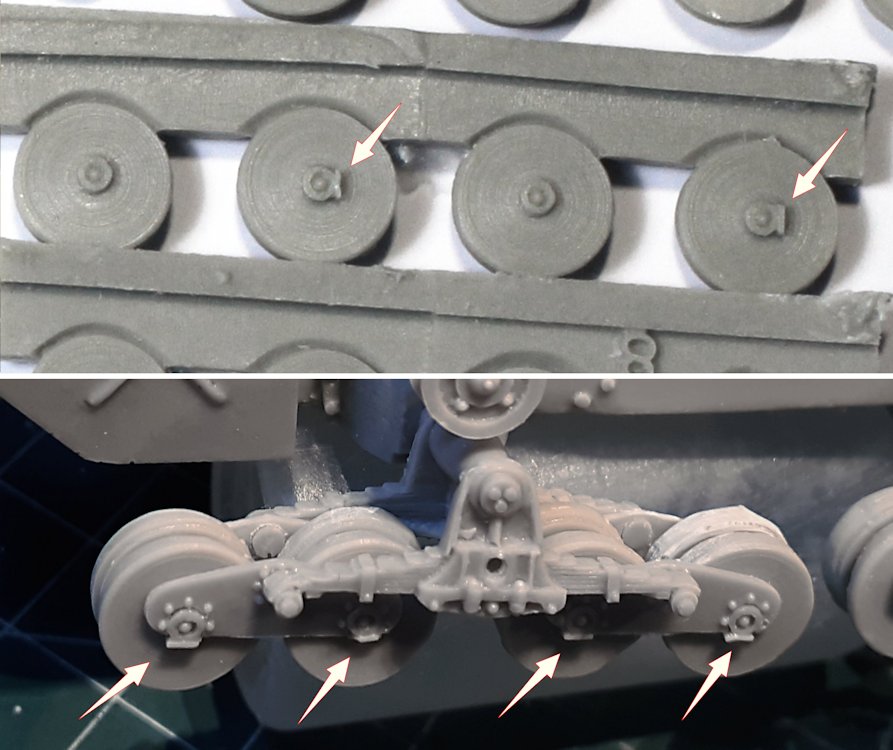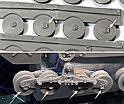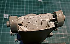 Laufwerk: Nach dem Abtrennen der Laufwerkteile von den Gießästen, beginnt eine gründliche Versäuberung der Teile. Insbesondere die Laufflächen der Laufrollen müssen gründlich geschliffen werden um die Reste des Gießastes zu entfernen. Bei dem Versäubern Pro Seite werden 8 Laufrollen-Paare verbaut, die an zwei Schwingarmen montiert werden. Während die vorderen 6 Laufrollen-Paare seitlich eine flache Oberfläche haben, weisen die hinteren zwei Laufrollen-Paare an der Seite ein Vertiefung auf. Die Montage des Antriebsrades am Heck ist recht unkompliziert. Dagegen muss man beim Anbringen des Leitrades die Bauanleitung und Bildvorlagen aus dem Internet genauer studieren. Die Positionierung der Teile der Antriebswelle an der rückwärtigen Seite der Bugplatte geht aus der Bauanleitung nicht klar hervor. Mit dem Anbringen der zwei Stützrollen an jeder Seite ist dann das Laufwerk fertiggestellt. Wanne und Turm: