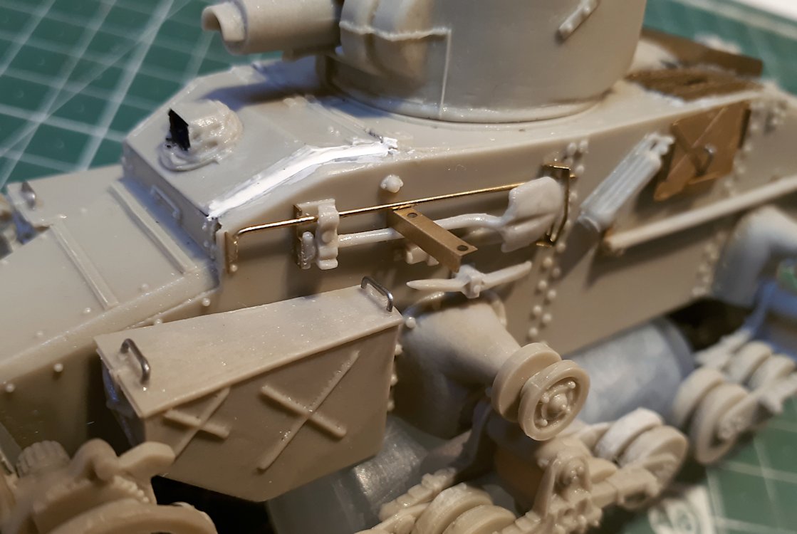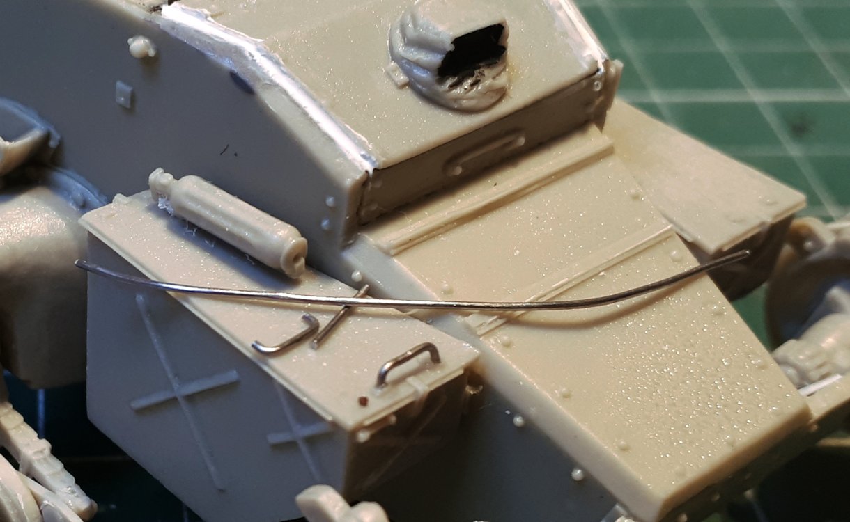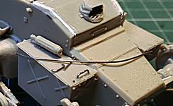 Es folgte das Anbringen der Staukästen an den vorderen Wannenseiten. Aus dem beiliegenden Zinndraht werden vier Haltegriffe geformt und je zwei auf der Oberseite der Staukästen angeklebt. Mit den PE-Teilen werden auf dem Heck die Abdeckgitter und an den Seiten der Wanne diverse Werkzeug- / Lampenhalterungen sowie Zurüstteile angebracht.