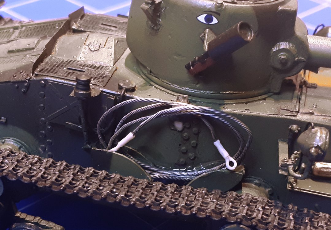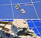Als Ergänzendes Zubehör habe ich mir ein Metallseil (0,6 mm) von Aber besorgt, mit der eine Abschlepptrosse dargestellt werden soll, die in zwei Halterungen an der rechten Wannenseite eingepasst wird. Das Metallseil ist sehr steif und musste erst stark erhitzt werden, bevor man es in Form biegen zu konnte. Die zwei Schlaufen am Ende der Trosse waren im Bausatz enthalten. Auch die Abschlepptrosse wurde nach der Bemalung angebracht. Kette: