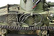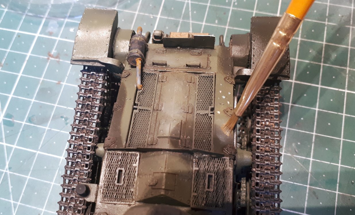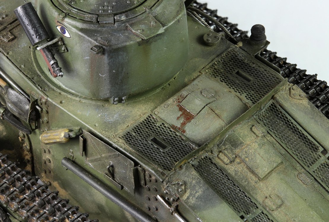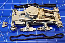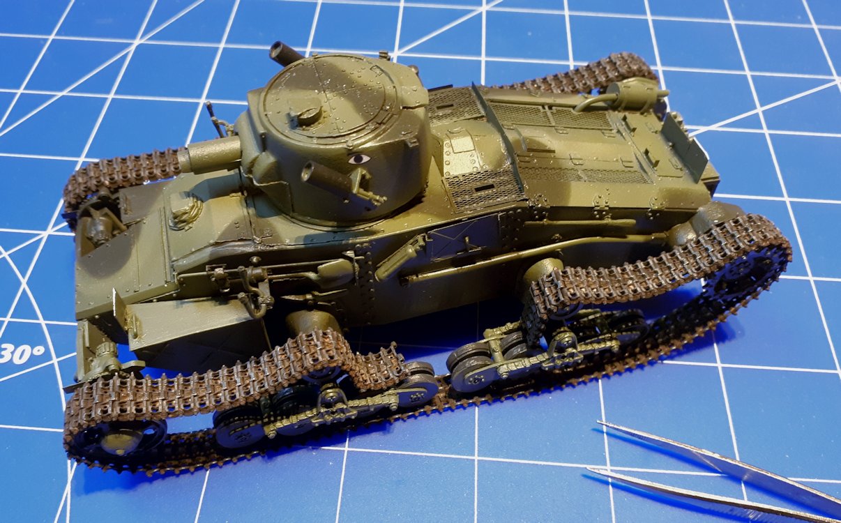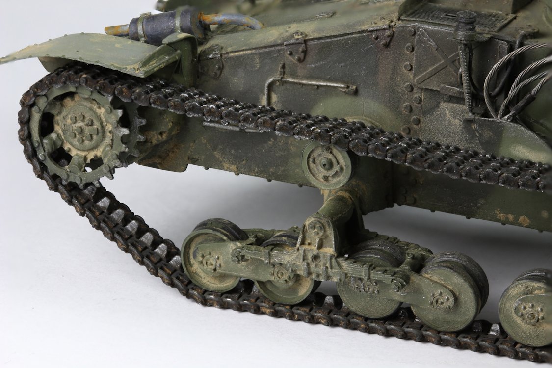 Die im Bausatz enthaltene Segmentkette ist auf acht Stränge aufgeteilt. Die Vorstellung diese steifen Kettensegmente zurechtbiegen zu müssen und die Tatsache, dass ein Kettensegment zerbrochen war, ließ den Wunsch reifen eine Einzelgliedkette zu verwenden. Nach einiger Zeit der Recherche fiel mir auf, dass die Kette des russischen T 26 mit der des Matilda identisch ist. Eine solche Einzelgliedkette ist bei Friul erhältlich und wurde fluchs beschafft. Die fertig montierte Kette wurde mit einem Brünierungsmittel geschwärzt und anschließend die erhabenen Stellen blank geschliffen. Da die Kette überwiegend frei liegt ließ sie sich beim Aufziehen problemlos verbinden.
