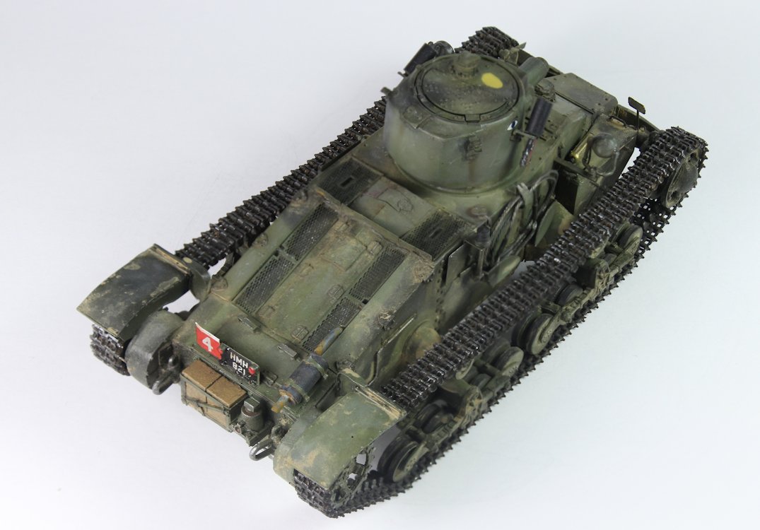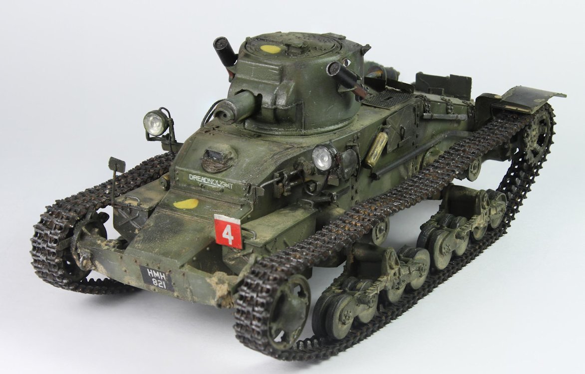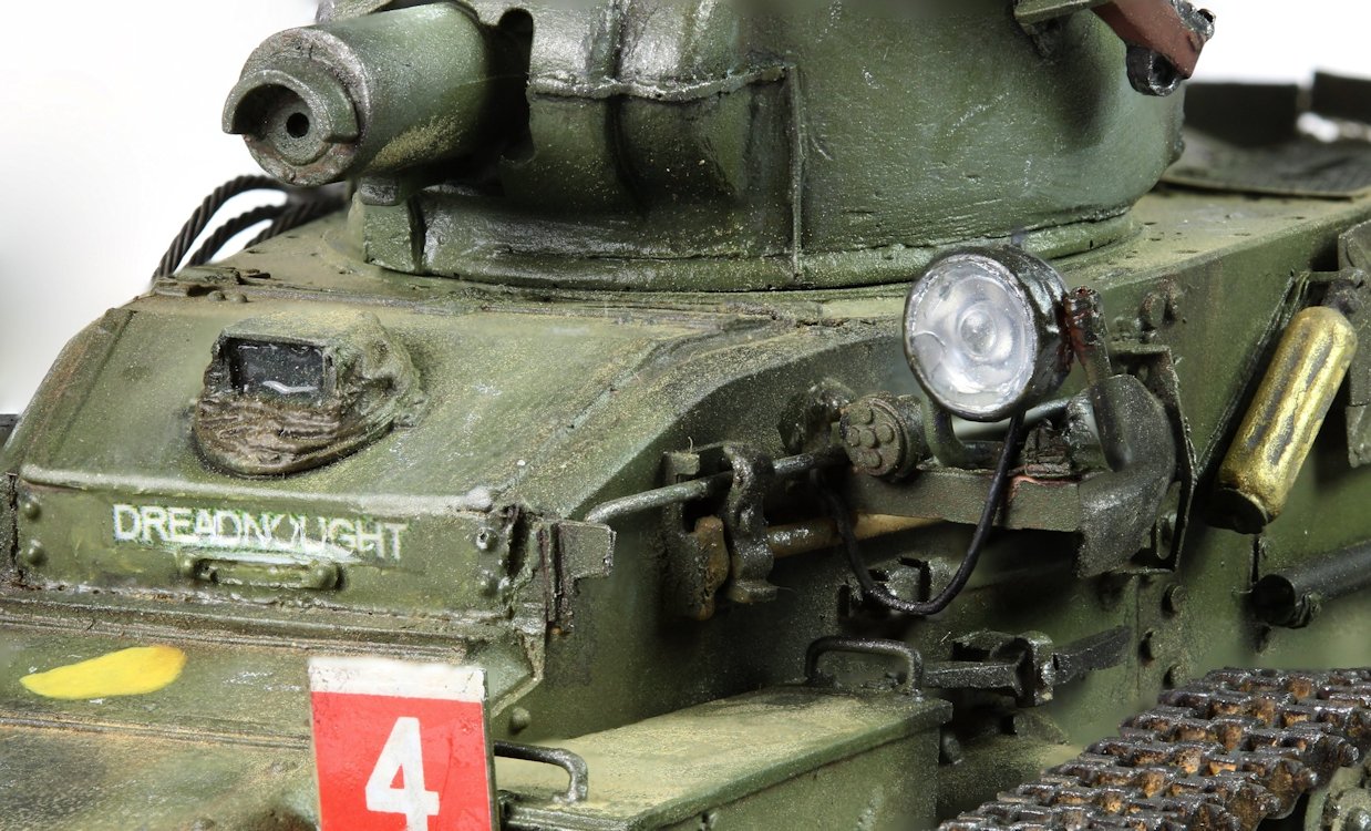 Vor dem Anbringen der Decals wurde eine erste Schicht Klarlack aufgetragen (Glanzlack + Seidenmatt von Vallejo im Verhältnis 1:1). Im Anschluss an den letzten Auftrag des Klarlackes, wurde noch an zwei Stellen des Panzers eine gelb-grüne Gasdetektor-Farbe aufgemalt. Diese Gasdetektor-Farbe wurde 1940 bei den Truppen häufig verwendet und dort aufgebracht, wo es der Kommandant und der Fahrer gut sehen können. Im Falle eines Gasangriffes verfärbt sich die Farbe rötlich. Decals: Die Decals beinhalten die Markierungen von 5 Fahrzeugen des 4. Royal Tank Regiment, das am 21. Mai 1940 bei dem Gegenangriff bei Arras beteiligt waren (DERWENT, DEMON, DEVIL, DREADNOUGHT und DOLPHIN). Kennzeichnend für die Panzer dieser Einheit war das "Chinesische Auge" an jeder Turmseite. Bei meinem Panzer hatte ich mich für den DREADNOUGHT entschieden, da ich von diesem Fahrzeug ein Foto als Vorlage hatte. Leider waren die Decals von sehr schlechter Qualität. Da sie vermutlich schon überaltert waren brachen sie nach dem Einweichen ganz leicht auseinander. Selbst das Bestreichen mit Liquid Decal Film (von Microscale), den ich zum Fixieren von selbst gedruckten Decals verwende, hatte nur wenig geholfen. Nachdem sich der Schriftzug DREADNOUGHT beim Anbringen auf den Panzer in seine Einzelzeile aufgelöst hatte, musste ich mich für eine andere Variante entscheiden. Als DERWENT, DEMON und DOLPHIN schließend auch noch zerbröselten, entschied ich mich den Namenszug selbst auf transparentes Decalpapier zu drucken. Womit ich dann wieder bei dem von Anfang an geplanten DREADNOUGHT war. Für gewöhnlich trugen die Panzer dieser Einheit an verschiedenen Stellen ein weißes Quadrat, das sie als Aufklärungsfahrzeug kennzeichnete, doch auf dem oben erwähnten Foto des DREADNOUGHT in Frankreich sind diese Quadrate nicht vorhanden. Somit habe ich sie hier auch weggelassen (obwohl ich sie ganz dekorativ finde). Im Anschluss an die Anbringung der Decals erfolgte wieder ein flächendeckender Auftrag einer Mischung von Glanzlack-Seidenmatt um alles zu versiegeln. Alterung/Effekte: