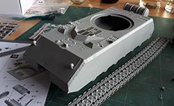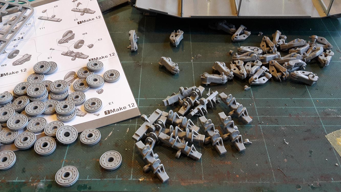 Wie bei fast allen Panzerfahrzeugen startet man mit der Montage der Wanne und dem Fahrwerk. Zunächst fühlt man sich von der Vielzahl der einzelnen Bauteile für das Fahrwerk und den daraus zu fertigen Baugruppen regelrecht erschlagen.