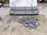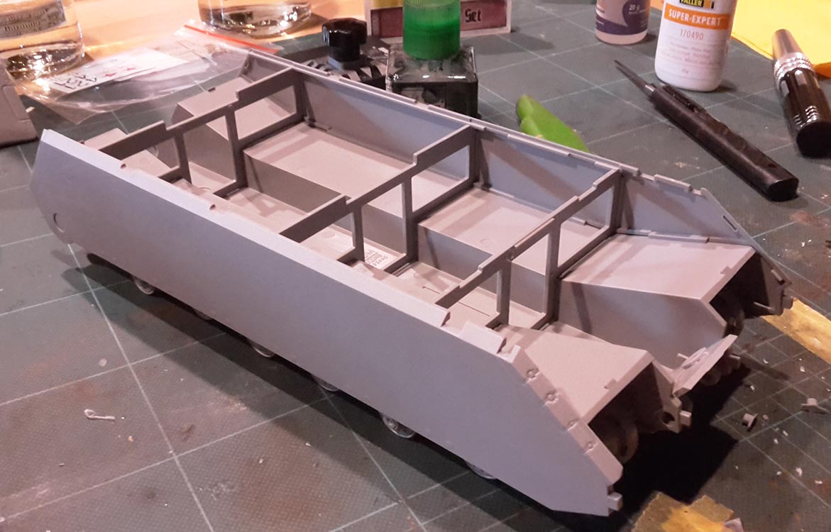 Die Unterwanne ist einteilig, baut darauf aber mit den großen Seitenwänden, wie auch Bug- und Heckplatte und natürlich abschließender Deckplatte einzeln auf. Aufgrund der massigen und großen Teile wird die Unterwanne mit drei stützenden Rahmen versehen.