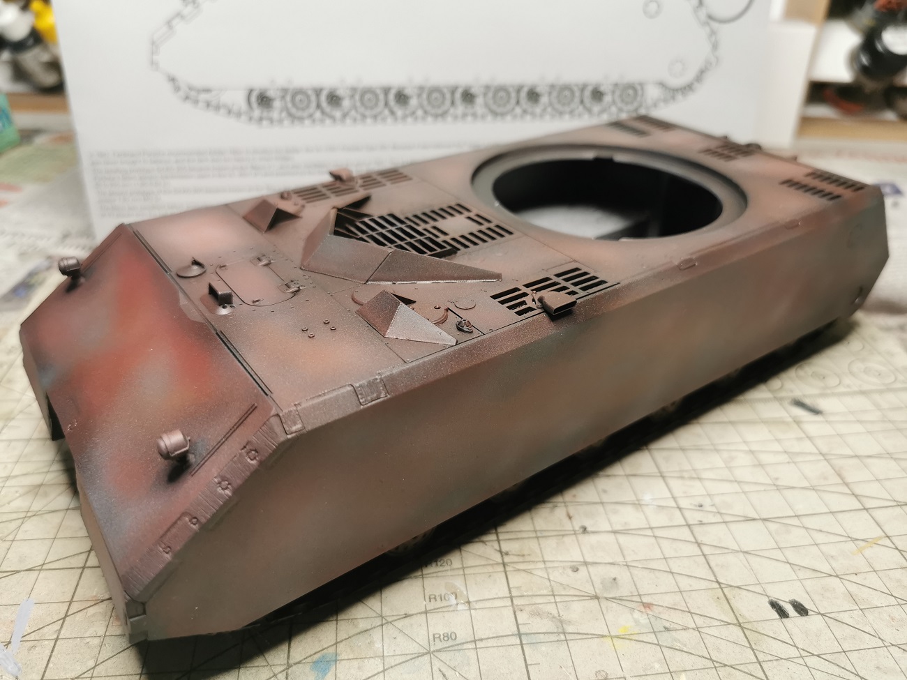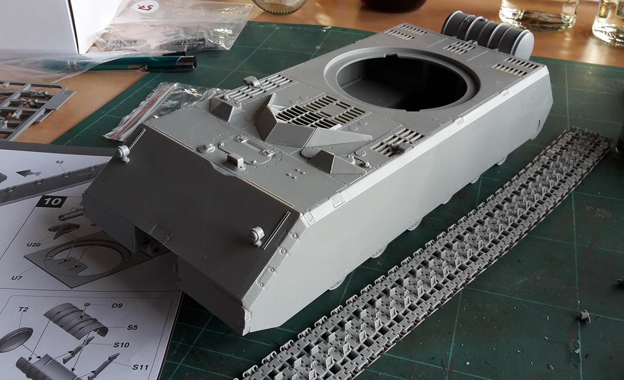 Die Deckplatte wird dann mit weiteren Kleinteilen verfeinern wie den Geschossabweisern, der Fahrerluke, Scheinwerfer und das zuvor angesprochene Treibstofffass. Letzteres setzt sich aus zwei Halbteilen zusammen, sodass man die Naht noch ordentlich versäubern muss.