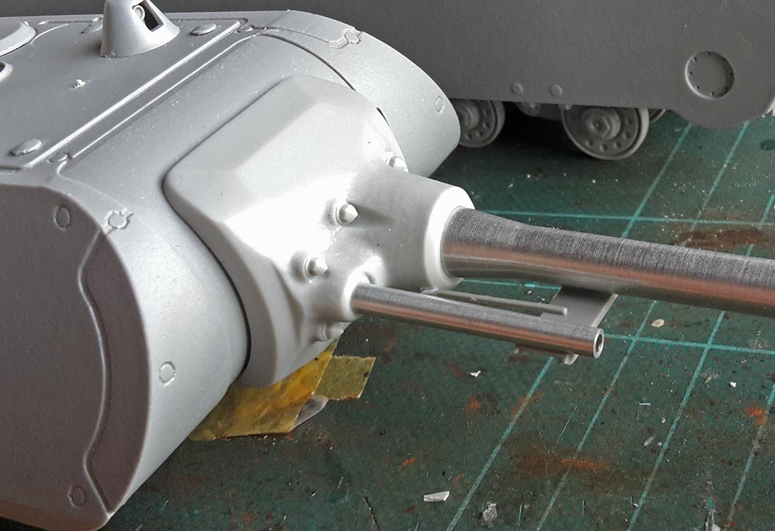 Normalerweise wird dann mit dem Bau der beiden Rohre in die Kanonenblende und diese widerum auf die turminterne Halterung der Bau abgeschlossen. Der Zusammenbau des Kanonenrohrs der Hauptbewaffnung aus zwei Halbteilen ist nicht mehr ganz zeitgemäß und mit lästiger Arbeit verbunden.